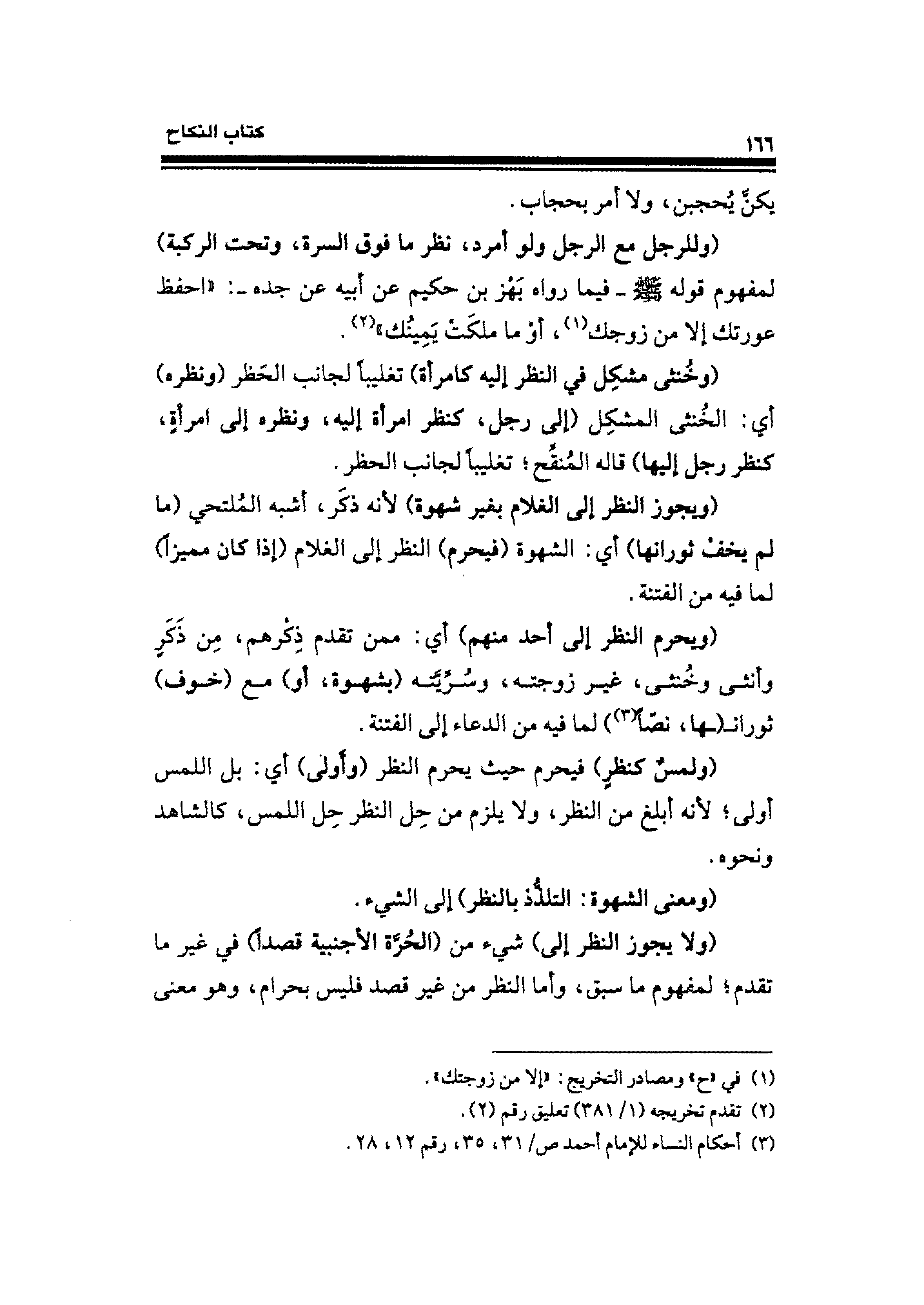 (ويجوز النظر إلى الغلام بغير شهوة) لأنه ذكَر، أشبه المُلتحي (ما لم يخفْ ثورانها) أي: الشهوة (فيحرم) النظر إلى الغلام (إذا كان مميزًا) لما فيه من الفتنة.