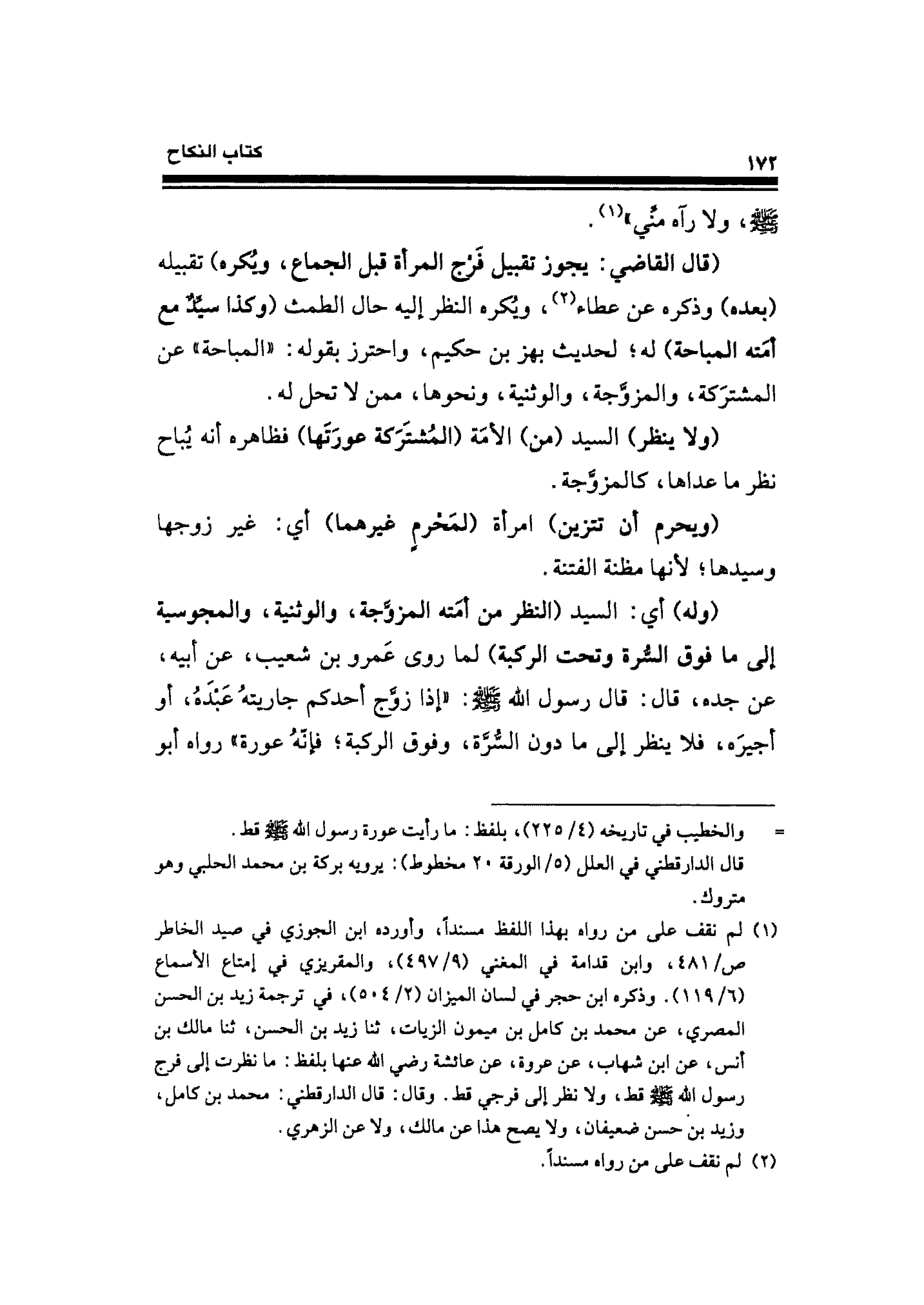 (¬١) لم نقف على من رواه بهذا اللفظ مسندًا، وأورده ابن الجوزي في صيد الخاطر ص / ٤٨١، وابن قدامة في المغني (٩/ ٤٩٧)، والمقريزي في إمتاع الأسماع (٦/ ١١٩). وذكره ابن حجر في لسان الميزان (٢/ ٥٠٤)، في ترجمة زيد بن الحسن المصري، عن محمد بن كامل بن ميمون الزيات، حدثنا زيد بن الحسن، حدثنا مالك بن أنس، عن ابن شهاب، عن عروة، عن عائشة - رضي الله عنها - بلفظ: ما نظرت إلى فرج رسول الله - صلى الله عليه وسلم - قط، ولا نظر إلى فرجي قط. وقال: قال الدارقطني. محمد بن كامل، وزيد بن حسن ضعيفان، ولا يصح هذا عن مالك، ولا عن الزهري.