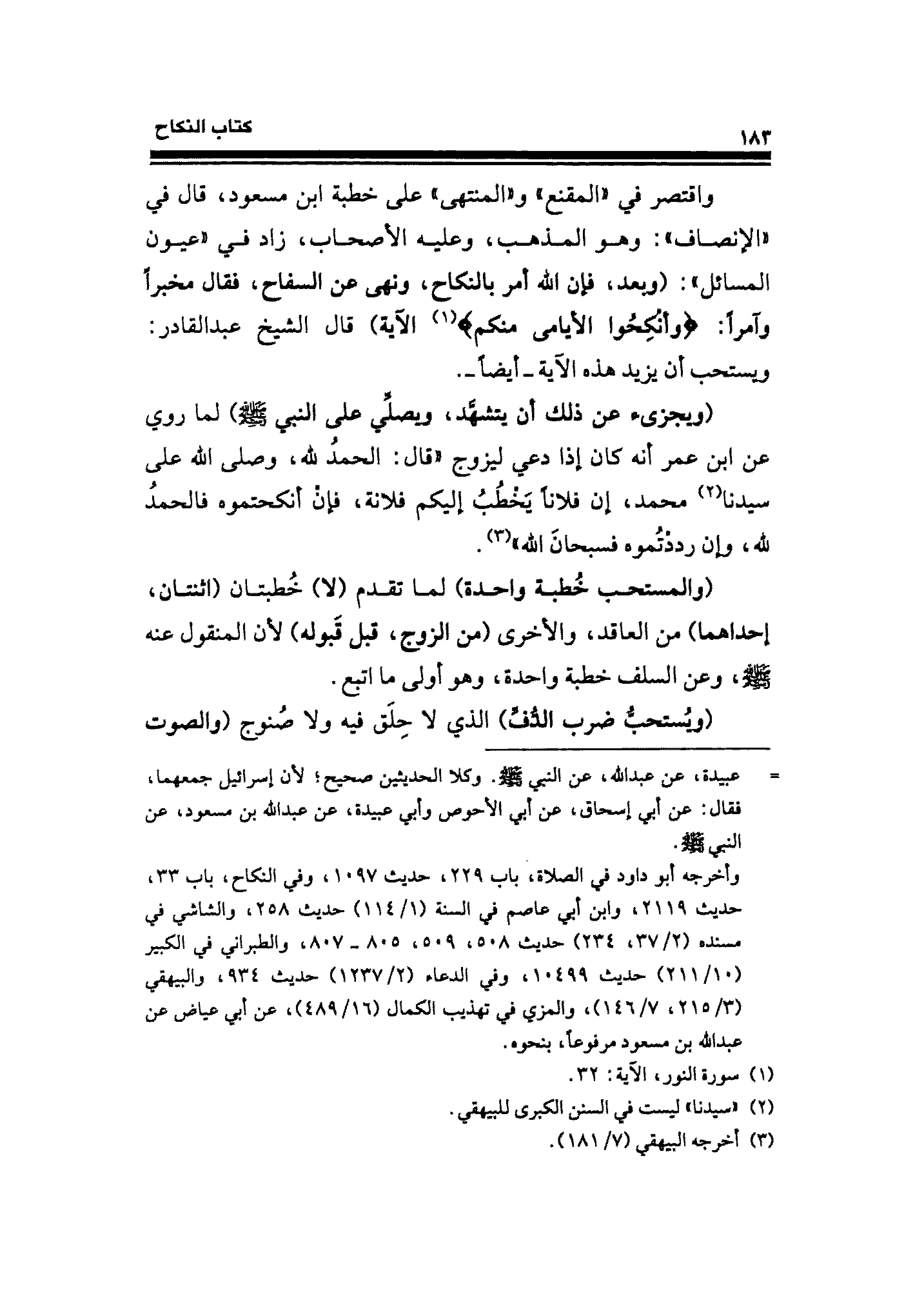 واقتصر في "المقنع" و"المنتهى" على خطبة ابن مسعود، قال في "الإنصاف": وهو المذهب، وعليه الأصحاب، زاد في "عيون المسائل": (وبعد، فإن الله أمر بالنكاح، ونهى عن السفاح، فقال مخبرًا وآمرًا: {وَأَنْكِحُوا الْأَيَامَى مِنْكُمْ} (¬١) الآية) قال الشيخ عبد القادر: ويستحب أن يزيد هذه الآية -أَيضًا-.
