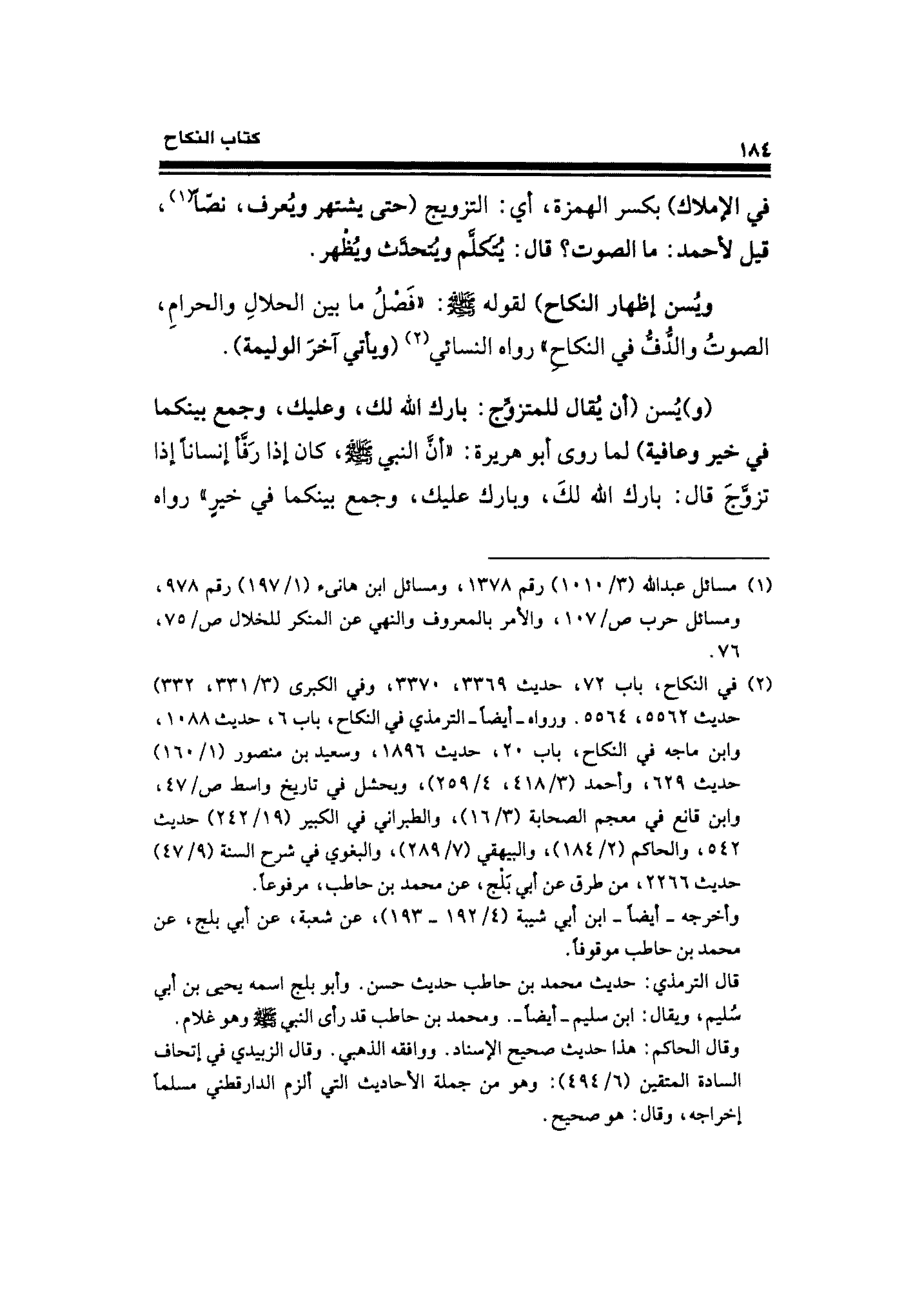 (¬٢) في النكاح، باب ٧٢، حديث ٣٣٦٩، ٣٣٧٠، وفي الكبرى (٣٣١/ ٣، ٣٣٢) حديث ٥٥٦٢، ٥٥٦٤. ورواه -أَيضًا- التِّرْمِذِيّ في النكاح، باب ٦، حديث ١٠٨٨، وابن ماجه في النكاح، باب ٢٠، حديث ١٨٩٦، وسعيد بن منصور (١/ ١٦٠) حديث ٦٢٩، وأَحمد (٣/ ٤١٨، ٤/ ٢٥٩)، وبحشل في تاريخ واسط ص / ٤٧، وابن قانع في معجم الصحابة (٣/ ١٦)، والطبراني في الكبير (١٩/ ٢٤٢) حديث ٥٤٢، والحاكم (٢/ ١٨٤)، والبيهقي (٧/ ٢٨٩)، والبغوي في شرح السنة (٩/ ٤٧) حديث ٢٢٦٦، من طرق عن أبي بَلْج، عن محمَّد بن حاطب، مرفوعًا.