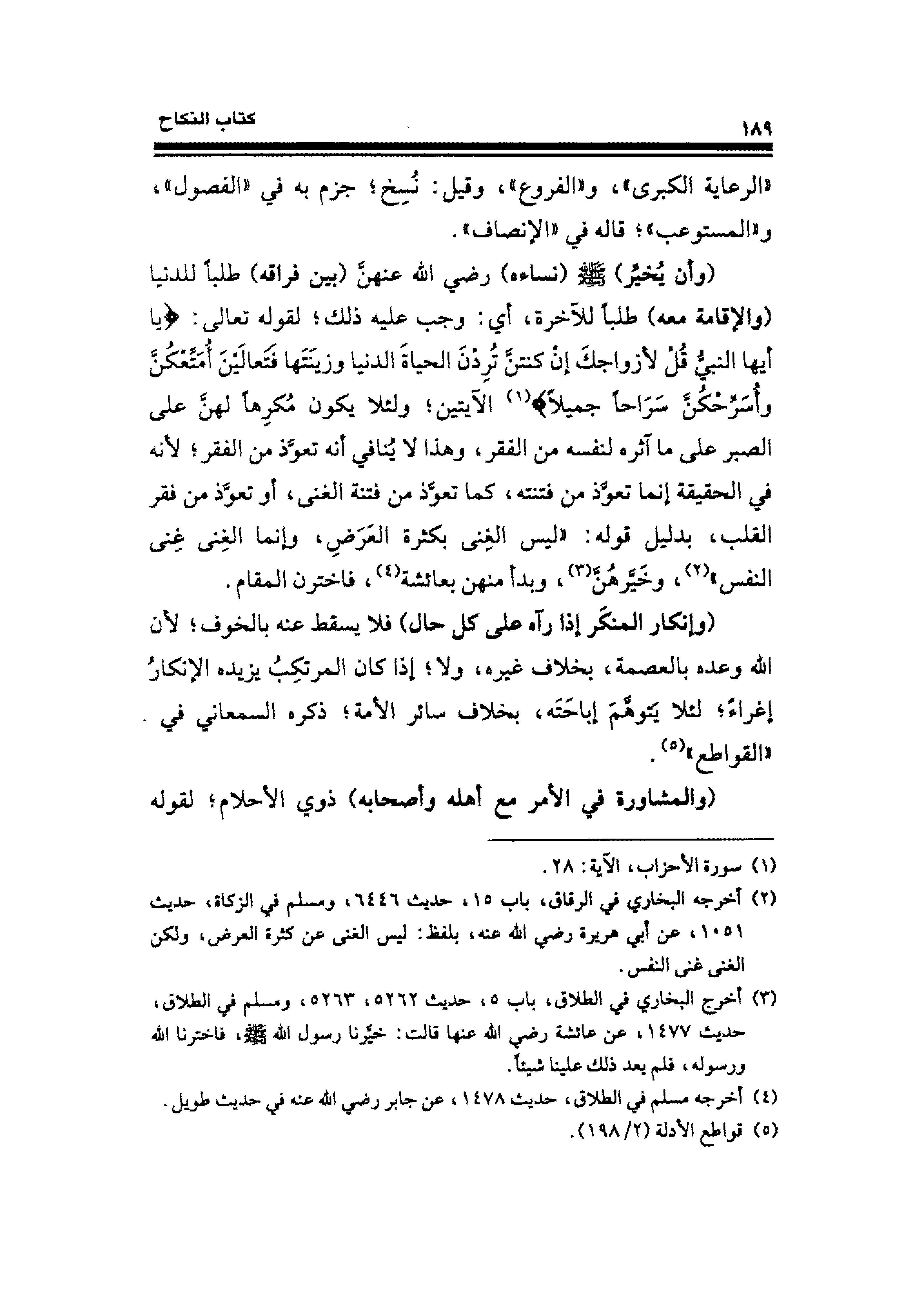 (¬٣) أخرج البخاري في الطلاق، باب ٥، حديث ٥٢٦٢، ٥٢٦٣، ومسلم في الطلاق، حديث ١٤٤٧، عن عائشة رضي الله عنها قالت: خيَّرنا رسول الله - صلى الله عليه وسلم - فاخترنا الله ورسوله، فلم يعد ذلك علينا شيئًا.