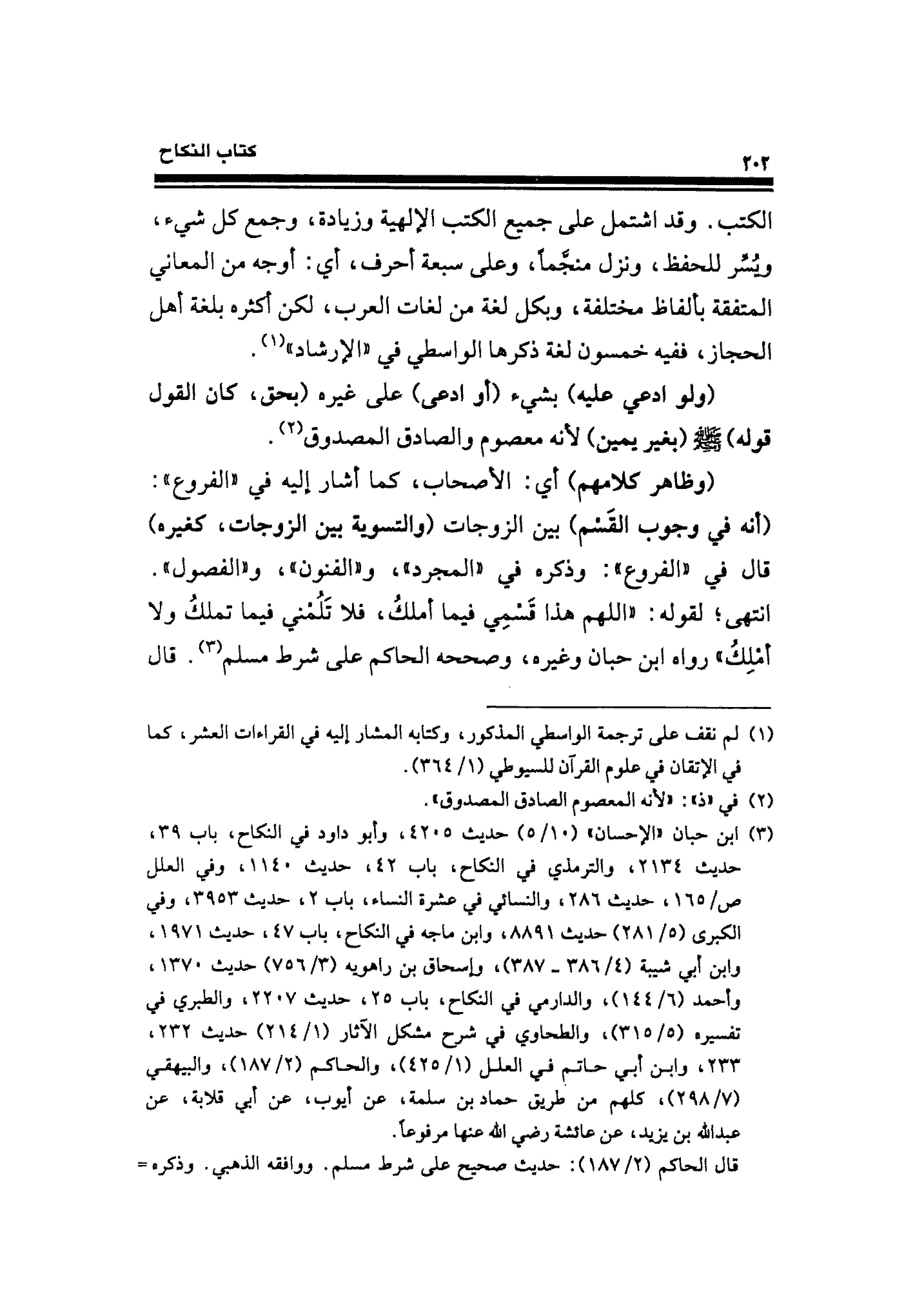 الكتب. وقد اشتمل على جميع الكتب الإلهية وزيادة، وجمع كل شيء، ويُسِّر للحفظ، ونزل منجَّمًا، وعلى سبعة أحرف، أي. أوجه من المعاني المتفقة بألفاظ مختلفة، وبكل لغة من لغات العرب، لكن أكثره بلغة أهل الحجاز، ففيه خمسون لغة ذكرها الواسطي في "الإرشاد" (¬١).