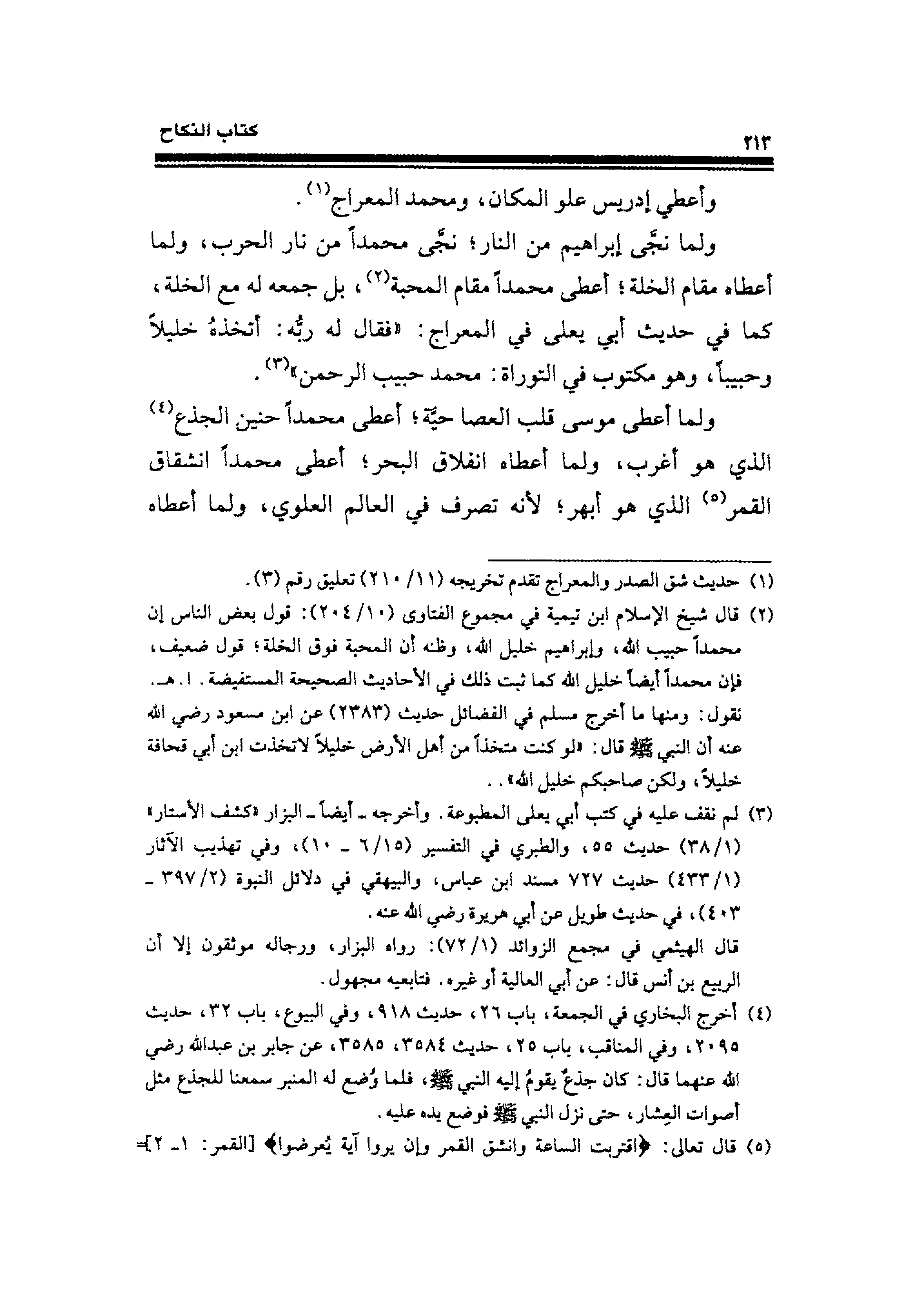 (¬٢) قال شيخ الإسلام ابن تيمية في مجموع الفتاوى (١٠/ ٢٠٤): قول بعض الناس إن محمدًا حبيب الله، وإبراهيم خليل الله، وظنه أن المحبة فوق الخلة؛ قول ضعيف، فإن محمدًا أيضًا خليل الله كما ثبت ذلك في الأحاديث الصحيحة المستفيضة. ا. هـ، نقول: ومنها ما أخرج مسلم في الفضائل حديث (٢٣٨٣) عن ابن مسعود رضي الله عنه أن النبي - صلى الله عليه وسلم - قال: "لو كنت متخذًا من أهل الأرض خليلًا لاتخذت ابن أبي قحافة خليلًا ولكن صاحبكم خليل الله".