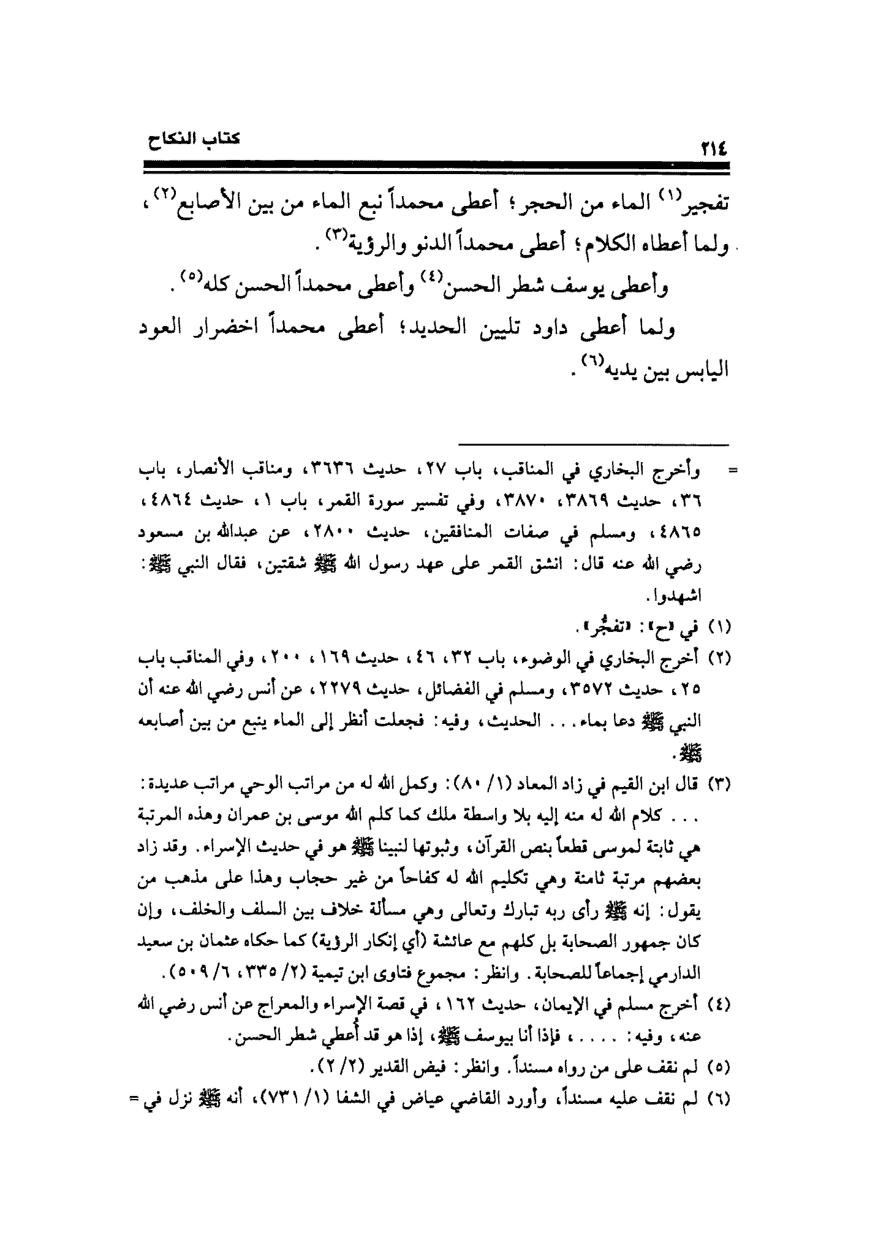 (¬٢) أخرج البخاري في الوضوء، باب ٣٢، ٤٦، حديث ١٦٩، ٢٠٠، وفي المناقب باب ٢٥، حديث ٣٥٧٢، ومسلم في الفضائل، حديث ٢٢٧٩، عن أنس رضي الله عنه أن النبي - صلى الله عليه وسلم - دعا بماء ... الحديث، وفي: فجعلت انظر إلى الماء ينبع من بين أصابعه - صلى الله عليه وسلم -.