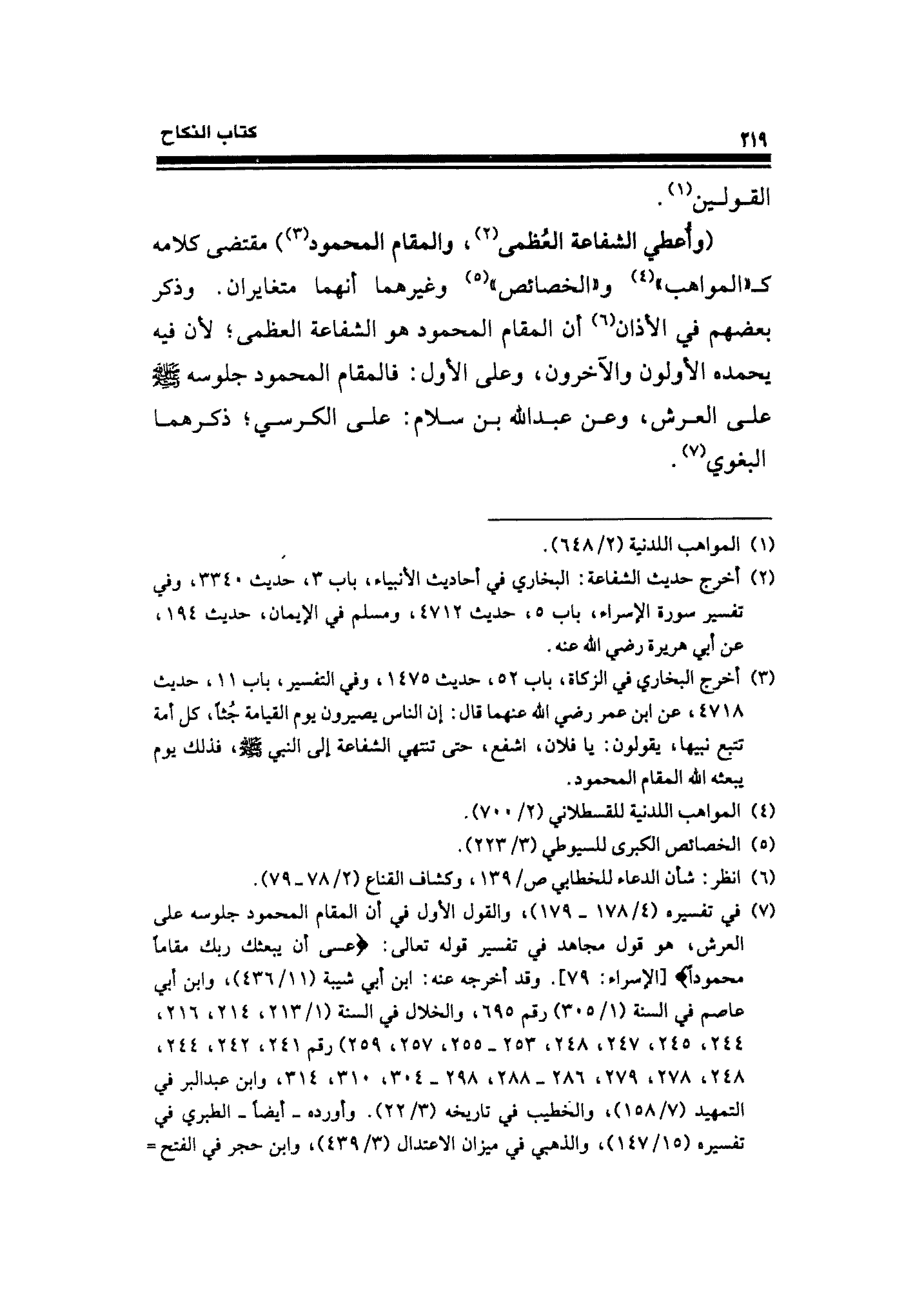 (¬٣) أخرج البخاري في الزكاة، باب ٥٢، حديث ١٤٧٥، وفي التفسير، باب ١١، حديث ٤٧١٨، عن ابن عمر رضي الله عنهما قال: إن الناس يصيرون يوم القيامة جُثًا، كل أمة تتبع نبيها، يقولون: يا فلان، اشفع، حتَّى تنتهي الشفاعة إلى النبي - صلى الله عليه وسلم -، فذلك يوم يبعثه الله المقام المحمود.