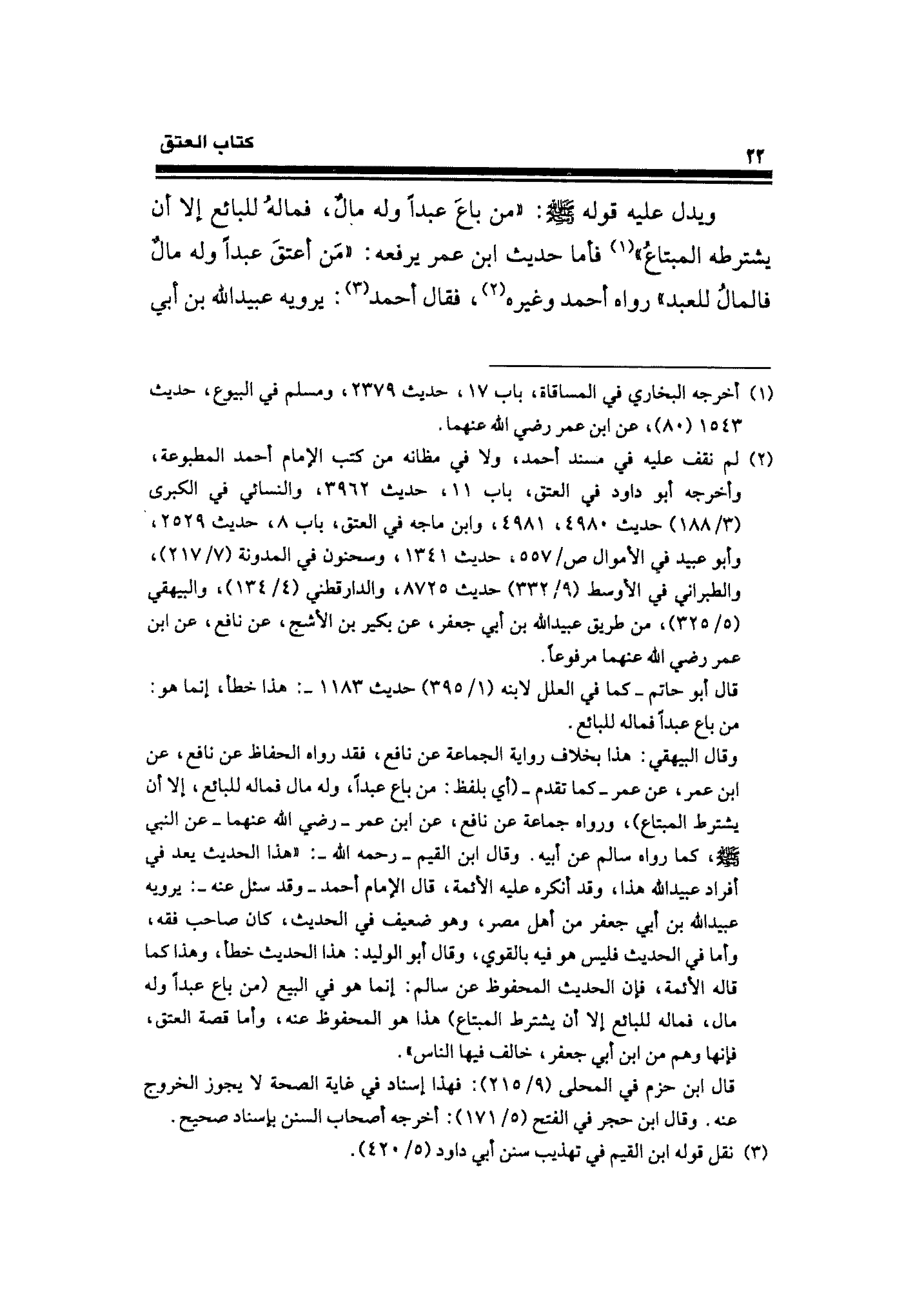 وقال البيهقي: هذا بخلاف رواية الجماعة عن نافع، فقد رواه الحفاظ عن نافع، عن ابن عمر، عن عمر -كما تقدم- (أي بلفظ: من باع عبدًا، وله مال فماله للبائع، إلا أن يشترط المبتاع)، ورواه جماعة عن نافع، عن ابن عمر -رضي الله عنهما- عن النبي - صلى الله عليه وسلم -، كما رواه سالم عن أبيه. وقال ابن القيم -رحمه الله-: "هذا الحديث بعد في أفراد عبيد الله هذا، وقد أنكر. عليه الأئمة، قال الإمام أحمد -وقد سئل عنه-: يرويه عيد الله بن أبي جعفر من أهل مصر، وهو ضعيف في الحديث، كان صاحب فقه، وأما في الحديث فليس هو فيه بالقوي، وقال أبو الوليد: هذا الحديث خطأ، وهذا كما قاله الأئمة، فإن الحديث المحفوظ عن سالم: إنما هو في البيع (من باع عبدًا وله مال، فماله للبائع إلا أن يشترط المبتاع) هذا هو المحفوظ عنه، وأما قصة العتق، فإنها وهم من ابن أبي جعفر، خالف فيها الناس".