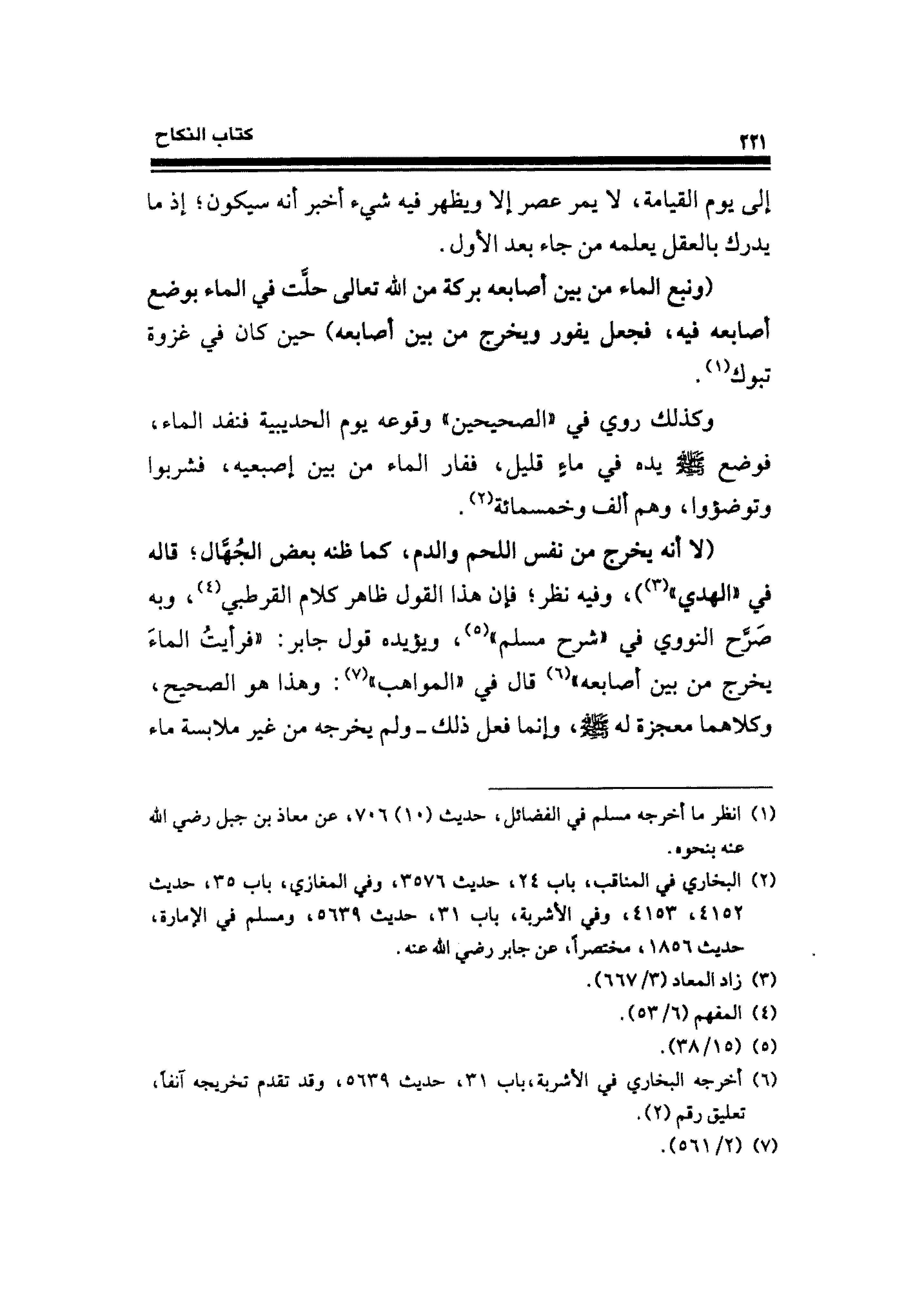 (لا أنَّه يخرج من نفس اللحم والدم، كما ظنه بعض الجُهَّال؛ قاله في "الهدي" (¬٣))، وفيه نظر؛ فإن هذا القول ظاهر كلام القرطبي (¬٤)، وبه صَرَّح النووي في "شرح مسلم" (¬٥)، ويؤيده قول جابر: "فرأيتُ الماءَ يخرج من بين أصابعه" (¬٦) قال في "المواهب" (¬٧): وهذا هو الصحيح، وكلاهما معجزة له - صلى الله عليه وسلم -، وإنما فعل ذلك -ولم يخرجه من غير ملابسة ماء