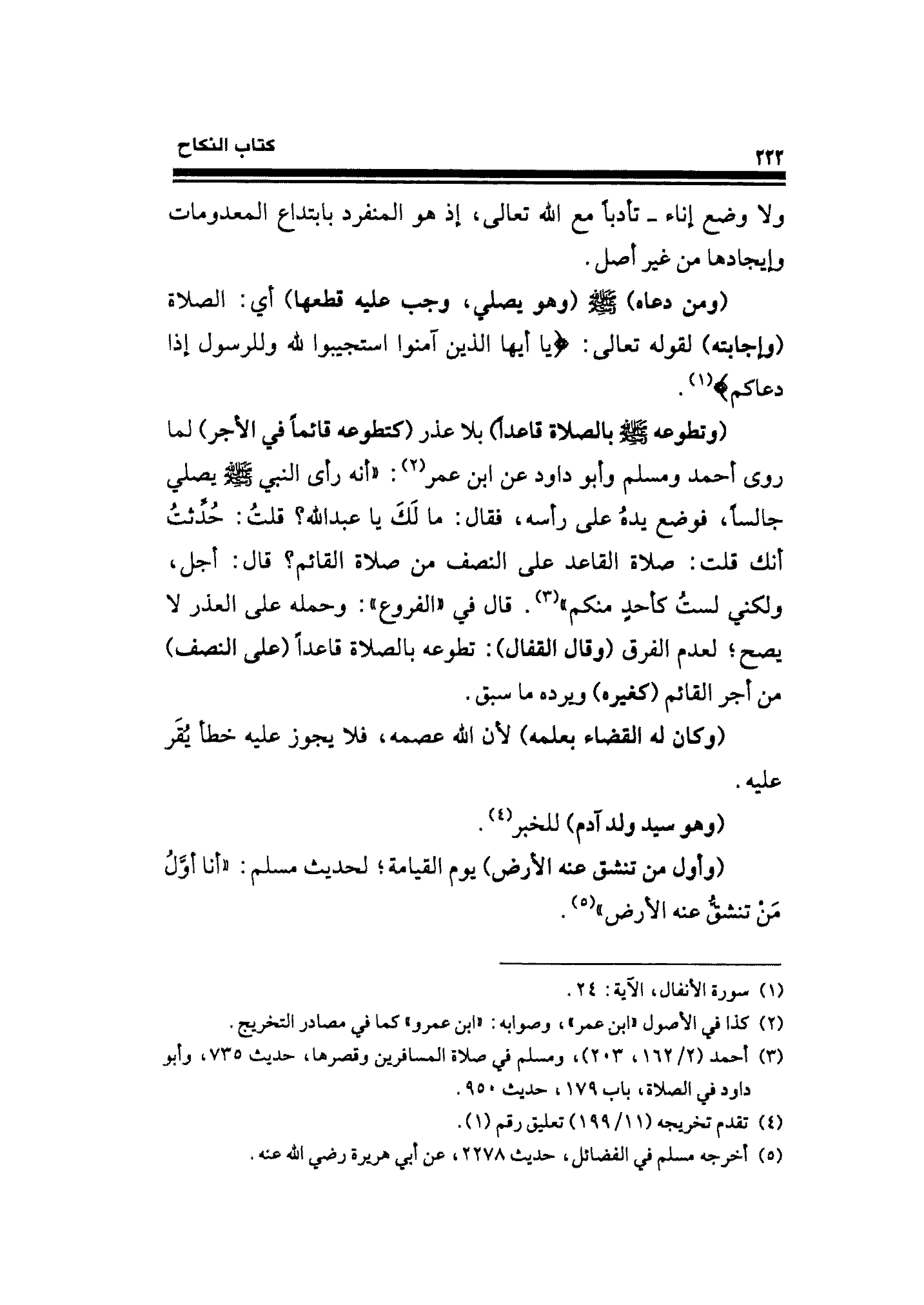 (ومن دعاه) - صلى الله عليه وسلم - (وهو يصلي، وجب عليه قطعها) أي: الصلاة (وإجابته) لقوله تعالى: {يَاأَيُّهَا الَّذِينَ آمَنُوا اسْتَجِيبُوا لِلَّهِ وَلِلرَّسُولِ إِذَا دَعَاكُمْ} (¬١).