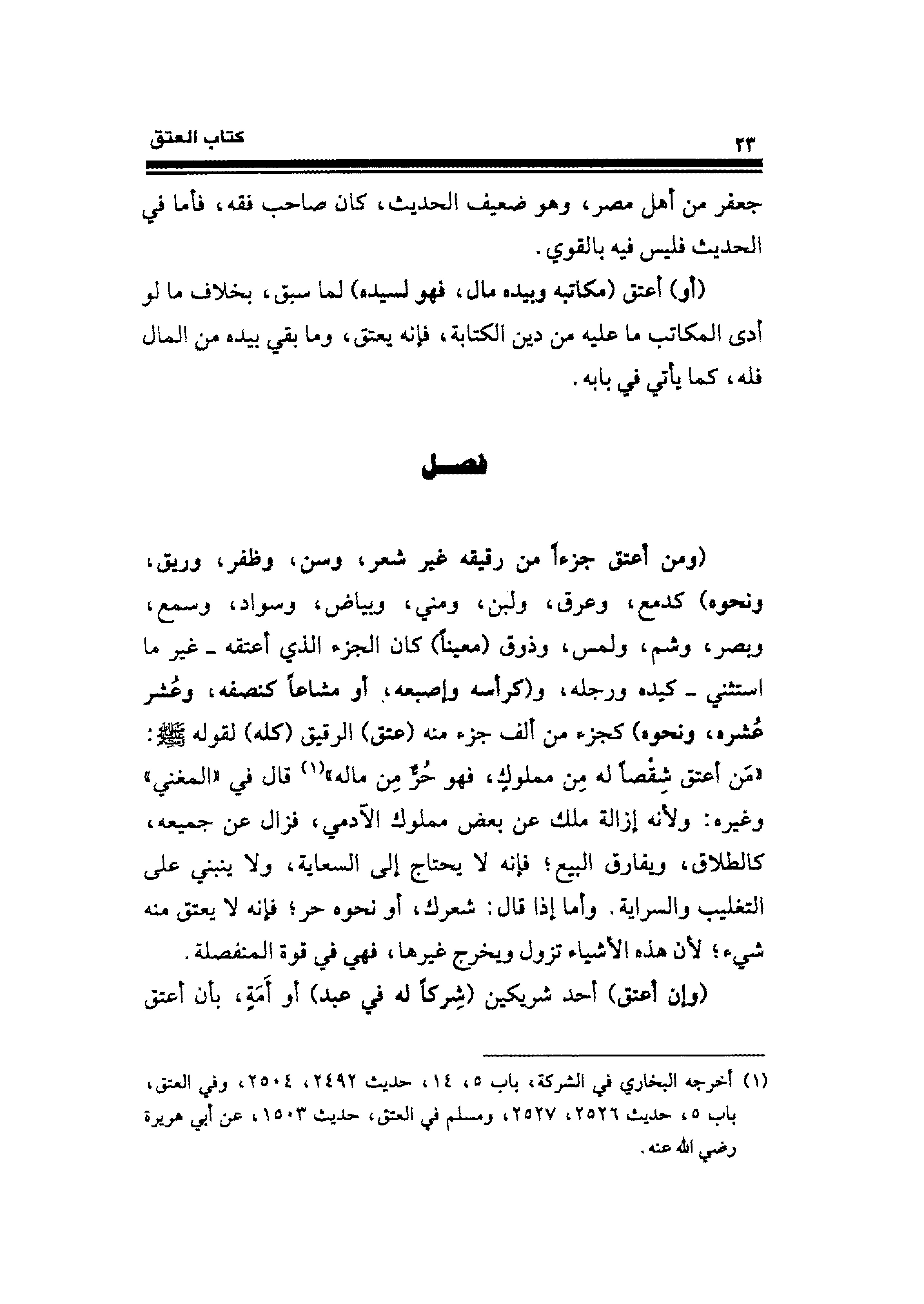 (ومن أعتق جزءًا من رقيقه غير شعر، وسن، وظفر، وريق، ونحوه) كدمع، وعرق، ولبن، ومني، وبياض، وسواد، وسمع، وبصر، وشم، ولمس، وذوق (معينًا) كان الجزء الذي أعتقه -غير ما استثنى- كيده ورجله، و (كرأسه وإصبعه، أو مشاعًا كنصفه، وعُشر عُشره، ونحوه) كجزء من ألف جزء منه (عتق) الرقيق (كله) لقوله - صلى الله عليه وسلم -: "مَن أعتق شِقْصًا له مِن مملوكٍ، فهو حُرٌّ مِن ماله" (¬١) قال في "المغنى" وغيره: ولأنه إزالة ملك عن بعض مملوك الآدمى، فزال عن جميعه، كالطلاق، ويفارق البيع؛ فإنه لا يحتاج إلى السعاية، ولا ينبنى على التغليب والسراية. وأما إذا قال: شعرك، أو نحوه حر؛ فإنه لا يعتق منه شيء؛ لأن هذه الأشياء تزول ويخرج غيرها، فهي في قوة المنفصلة.