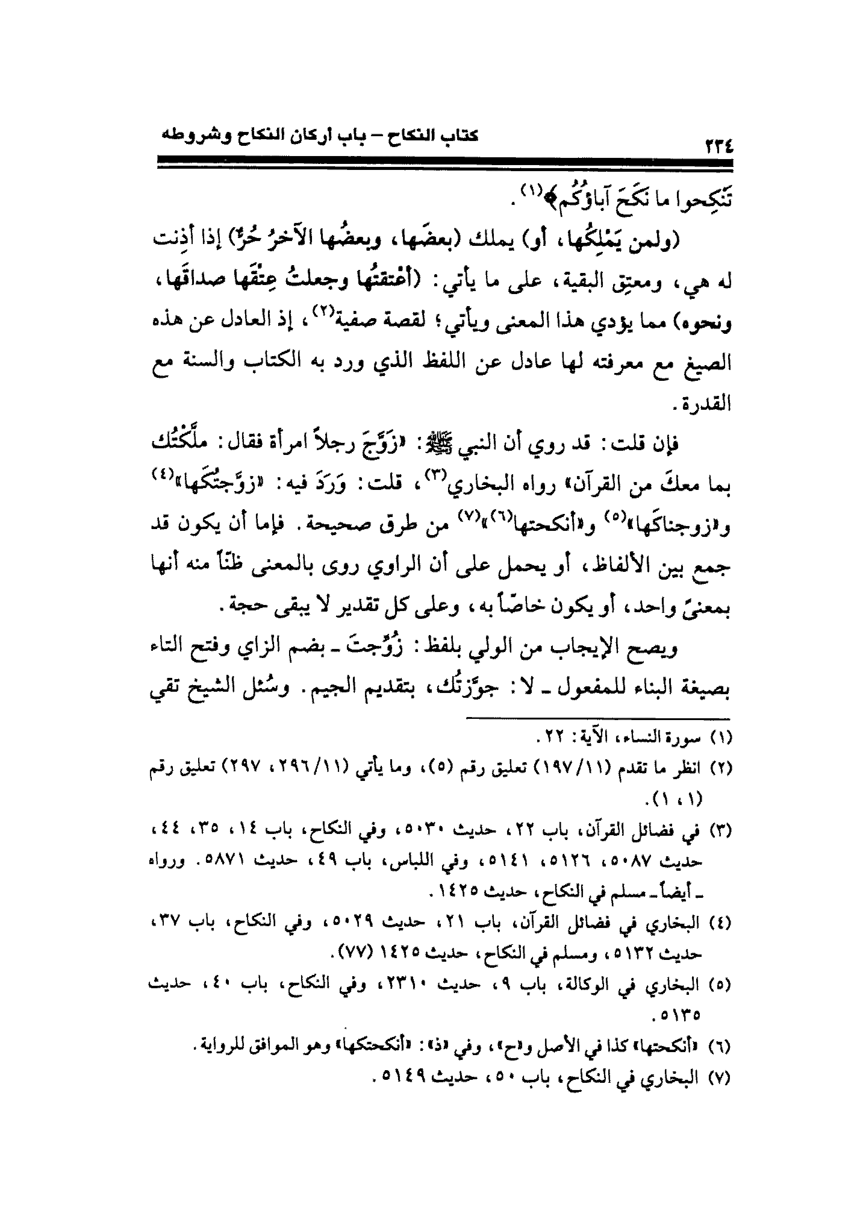 فإن فلت: قد روي أن النبي - صلى الله عليه وسلم -: "زَوَّجَ رجلًا امرأة فقال: ملَّكْتُكْ بما معكَ من القرآن" رواه البخاري (¬٣)، قلت: وَرَدَ فيه: "زوَّجتُكَها" (¬٤) و (زوجناكَها" (¬٥) و"أنكحتها (¬٦) " (¬٧) من طرق صحيحة. فإما أن يكون قد جمع بين الألفاظ، أو يحمل على أن الراوي روى بالمعنى ظنًّا منه أنها بمعنىً واحد، أو يكون خاصًّا به، وعلى كل تقدير لا يبقى حجة.