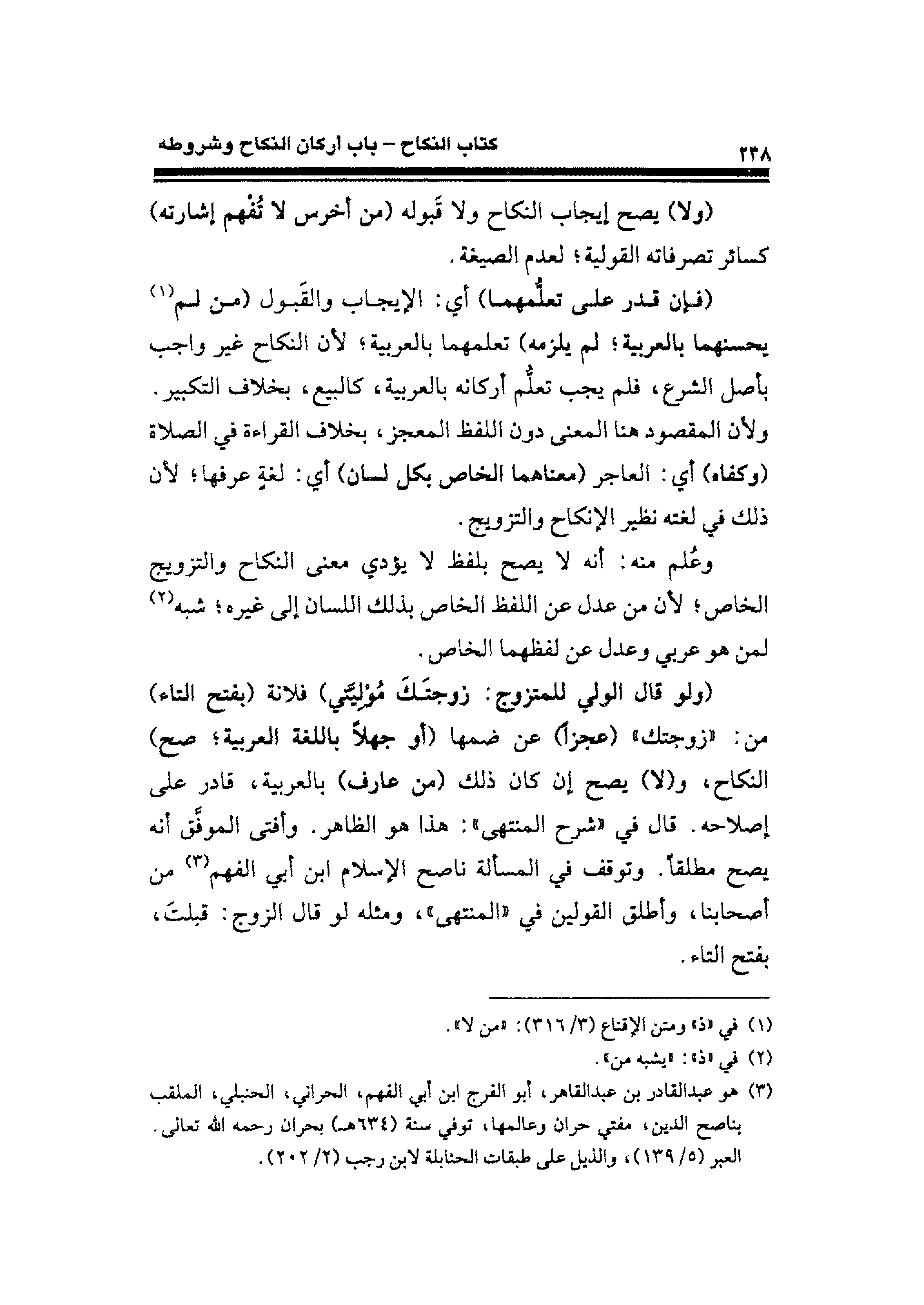 (ولو قال الولي للمتزوج: زوجتَكَ مُولِيَّتي) فلانة (بفتح التاء) من: "زوجتك" (عجزًا) عن ضمها (أو جهلًا باللغة العربية؛ صح) النكاح، و (لا) يصح إن كان ذلك (من عارف) بالعربية، قادر على إصلاحه. قال في "شرح المنتهى": هذا هو الظاهر. وأفتى الموفق أنه يصح مطلقًا. وتوقف في المسألة ناصح الإسلام ابن أبي الفهم (¬٣) من أصحابنا، وأطلق القولين في "المنتهى"، ومثله لو قال الزوج: قبلتَ، بفتح التاء.