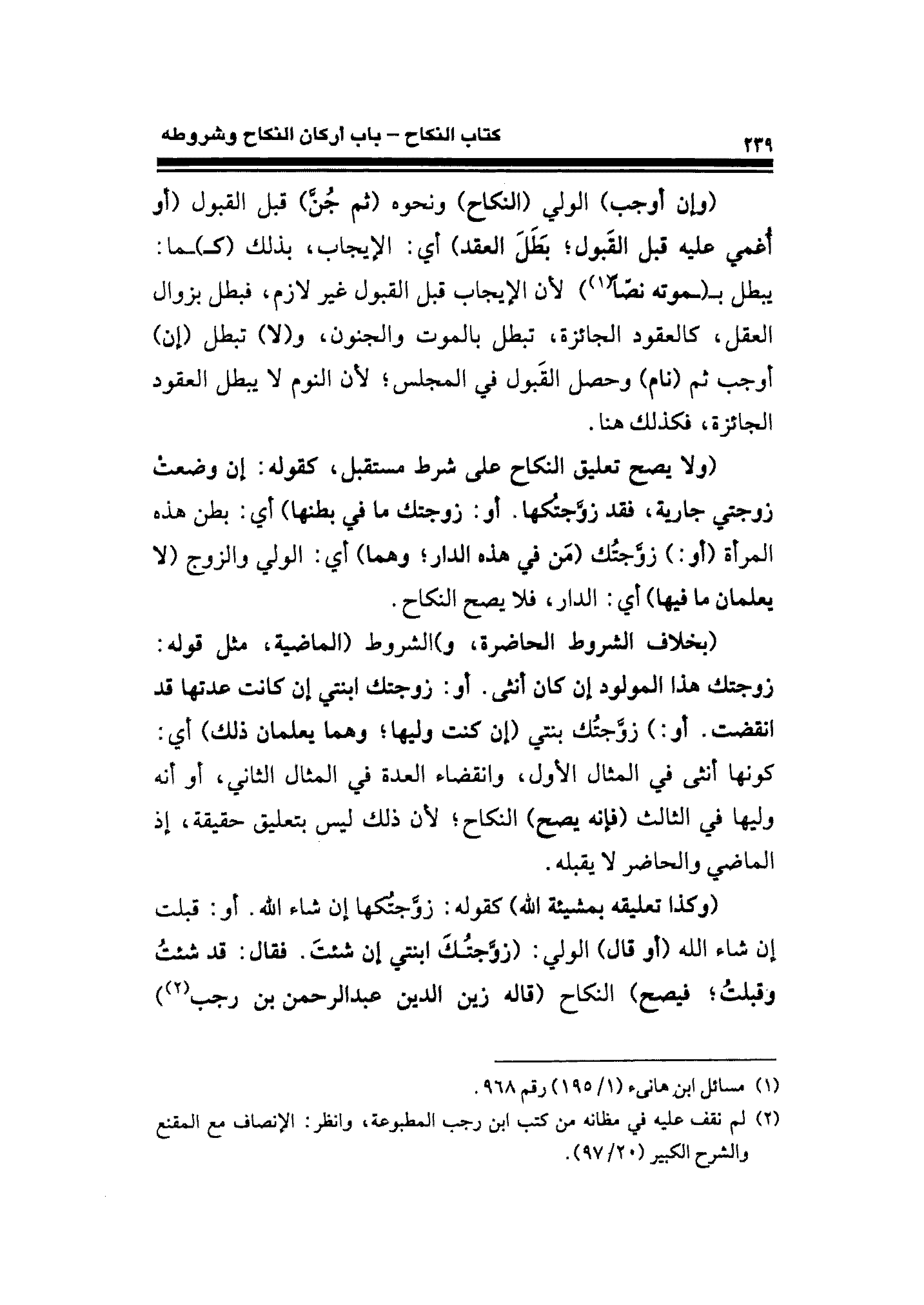 (وكذا تعليقه بمشيئة الله) كقوله: زوَّجتُكها إن شاء الله. أو: قبلت إن شاء الله (أو قال) الولي: (زوَّجتُكَ ابنتي إن شئتَ. فقال: قد شئتُ وقبلتُ؛ فيصح) النكاح (قاله زين الدين عبد الرحمن بن رجب (¬٢))