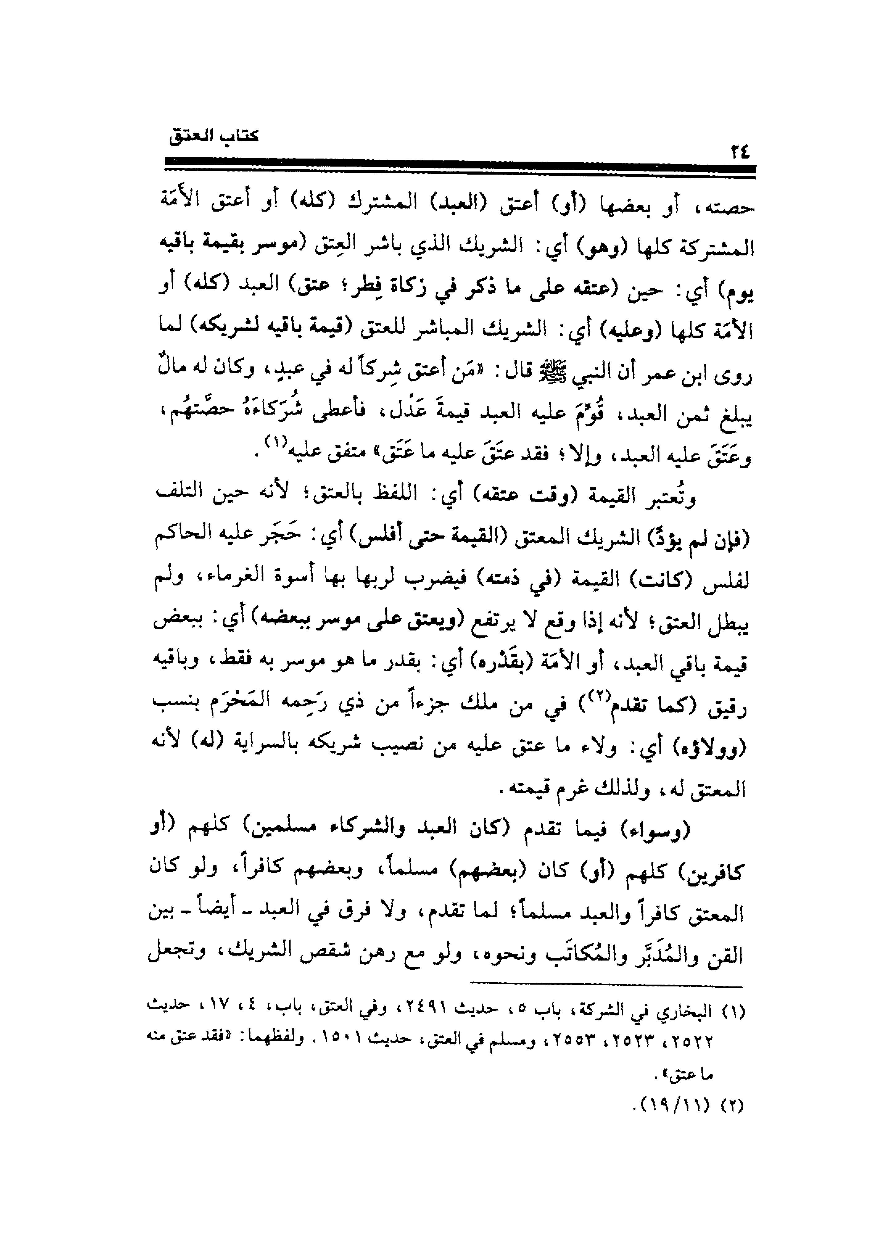 (¬١) البخاري في الشركة، باب ٥، حديث ٢٤٩١، وفي العتق، باب، ٤، ١٧، حديث ٢٥٢٢، ٢٥٢٣، ٢٥٥٣، ومسلم في العتق، حديث ١٥٠١. ولفظهما: "فقد عتق منه ما عتق".