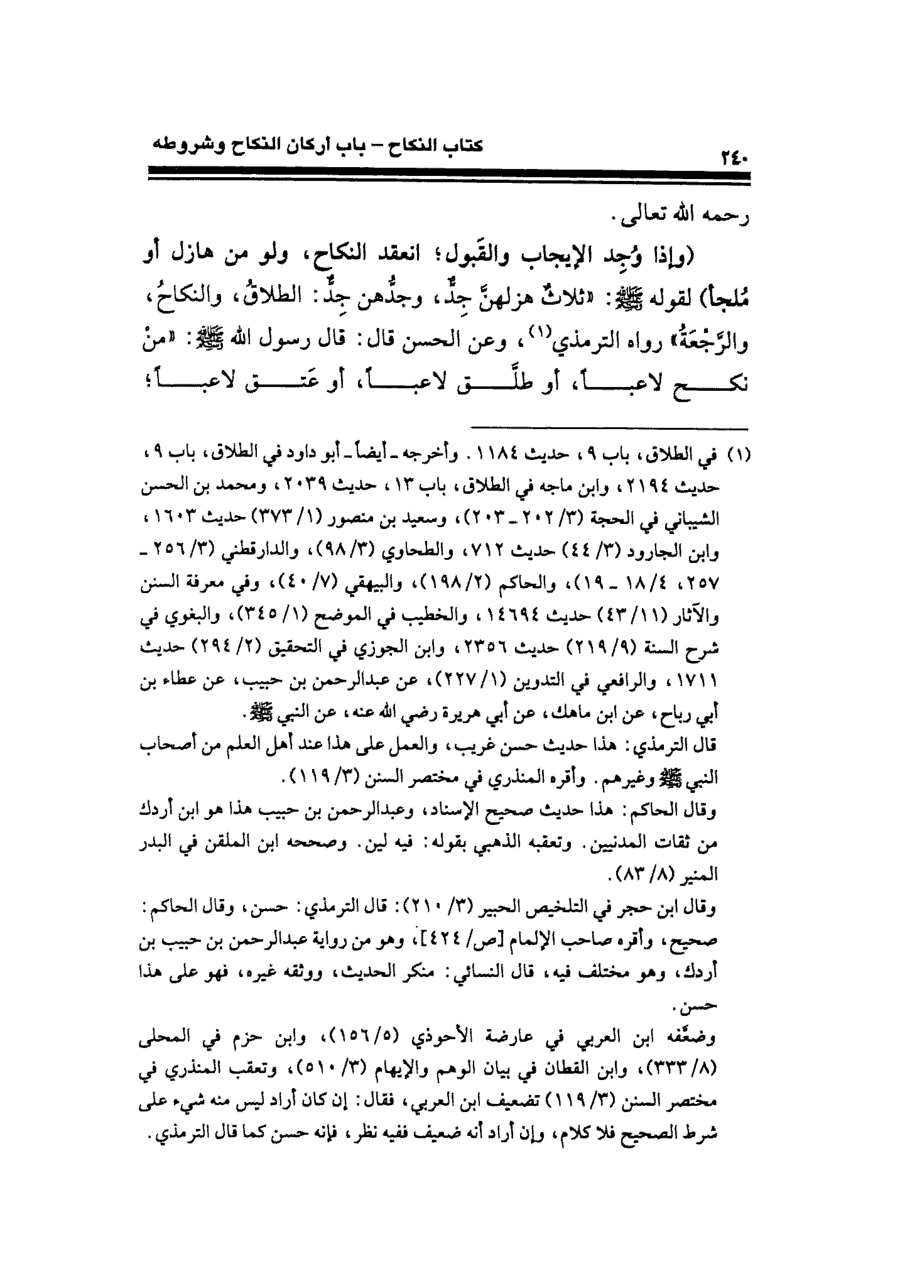 (وإذا وُجِد الإيجاب والقَبول؛ انعقد النكاح، ولو من هازل أو مُلجأ) لقوله - صلى الله عليه وسلم -: "ثلاثٌ هزلهنَّ جِدٌّ، وجدُّهن جِدٌّ: الطلاقُ، والنكاحُ، والرَّجْعَةُ" رواه الترمذي (¬١)، وعن الحسن قال: قال رسول الله - صلى الله عليه وسلم -: "منْ نكح لاعبًا، أو طلَّق لاعبًا، أو عَتق لاعبًا؛