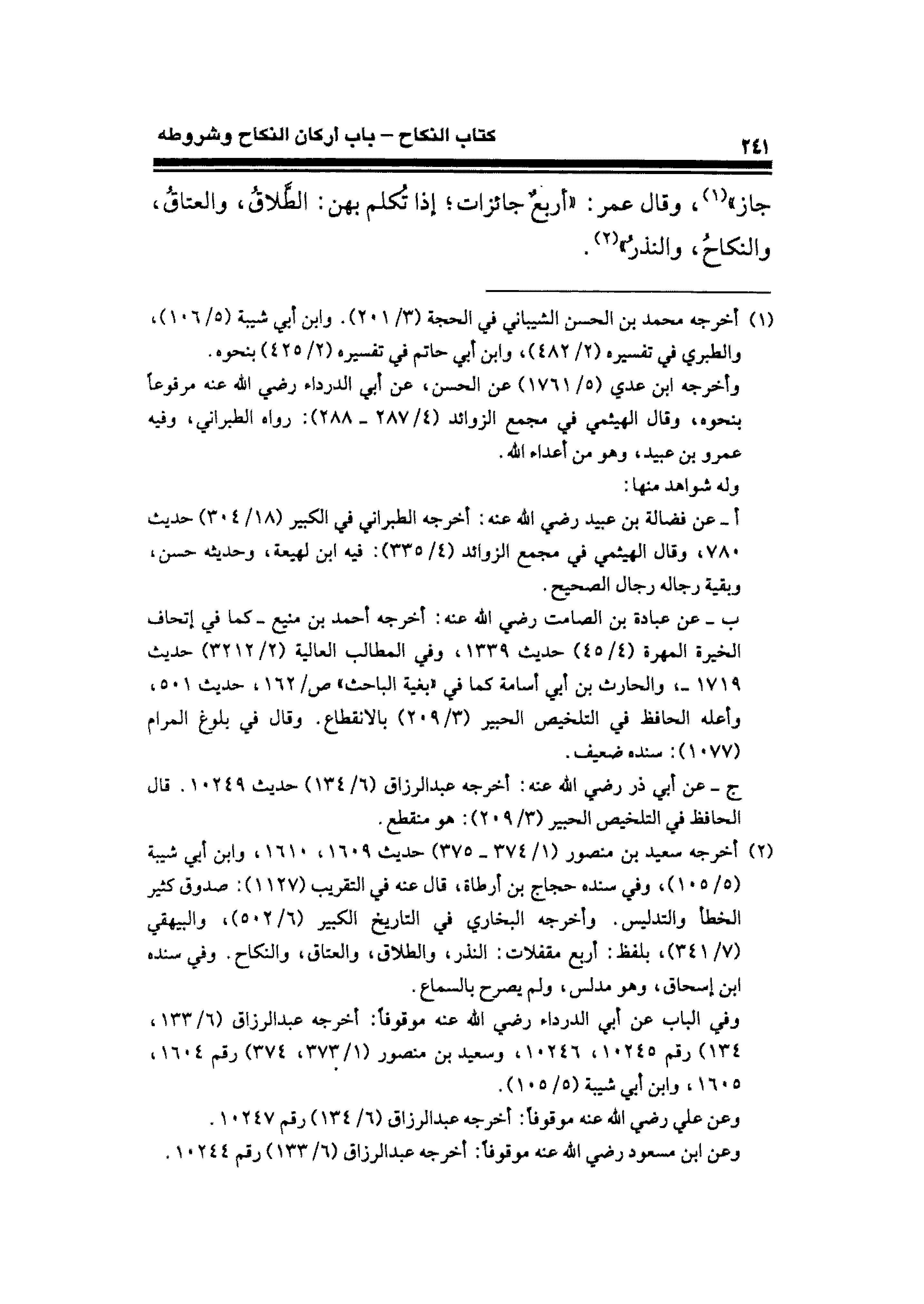 (¬٢) أخرجه سعيد بن منصور (١/ ٣٧٤ - ٣٧٥) حديث ١٦٠٩، ١٦١٠، وابن أبي شيبة (٥/ ١٠٥)، وفي سنده حجاج بن أرطاة، قال عنه في التقريب (١١٢٧): صدوق كثير الخطأ والتدليس. وأخرجه البخاري في التاريخ الكبير (٦/ ٥٠٢)، والبيهقي (٧/ ٣٤١)، بلفظ: أربع مقفلات: النذر، والطلاق، والعتاق، والنكاح. وفي سنده ابن إسحاق، وهو مدلس ولم يصرح بالسماع.
