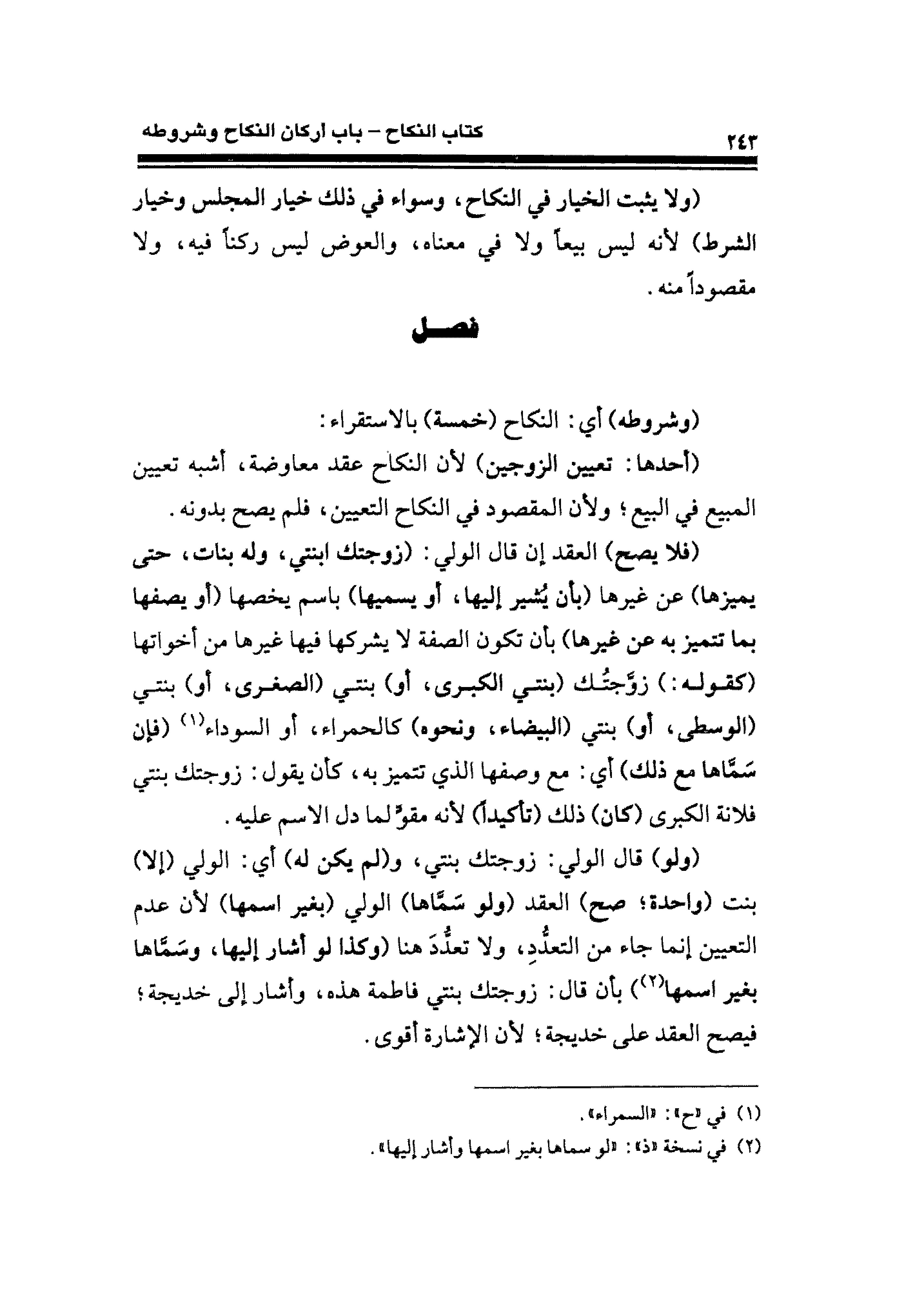 (فلا يصح) العقد إن قال الولي: (زوجتك ابنتي، وله بنات، حتى يميزها) عن غيرها (بأن يُشير إليها، أو يسميها) باسم يخصها (أو يصفها بما تتميز به عن غيرها) بأن تكون الصفة لا يشركها فيها غيرها من أخواتها (كقوله:) زوَّجتُك (بنتي الكبرى، أو) بنتي (الصغرى، أو) بنتي (الوسطى، أو) بنتي (البيضاء، ونحوه) كالحمراء، أو السوداء (¬١) (فإن سَماها مع ذلك) أي: مع وصفها الذي تتميز به، كان يقول: زوجتك بنتي فلانة الكبرى (كان) ذلك (تأكيدًا) لأنه مقوٍّ لما دل الاسم عليه.