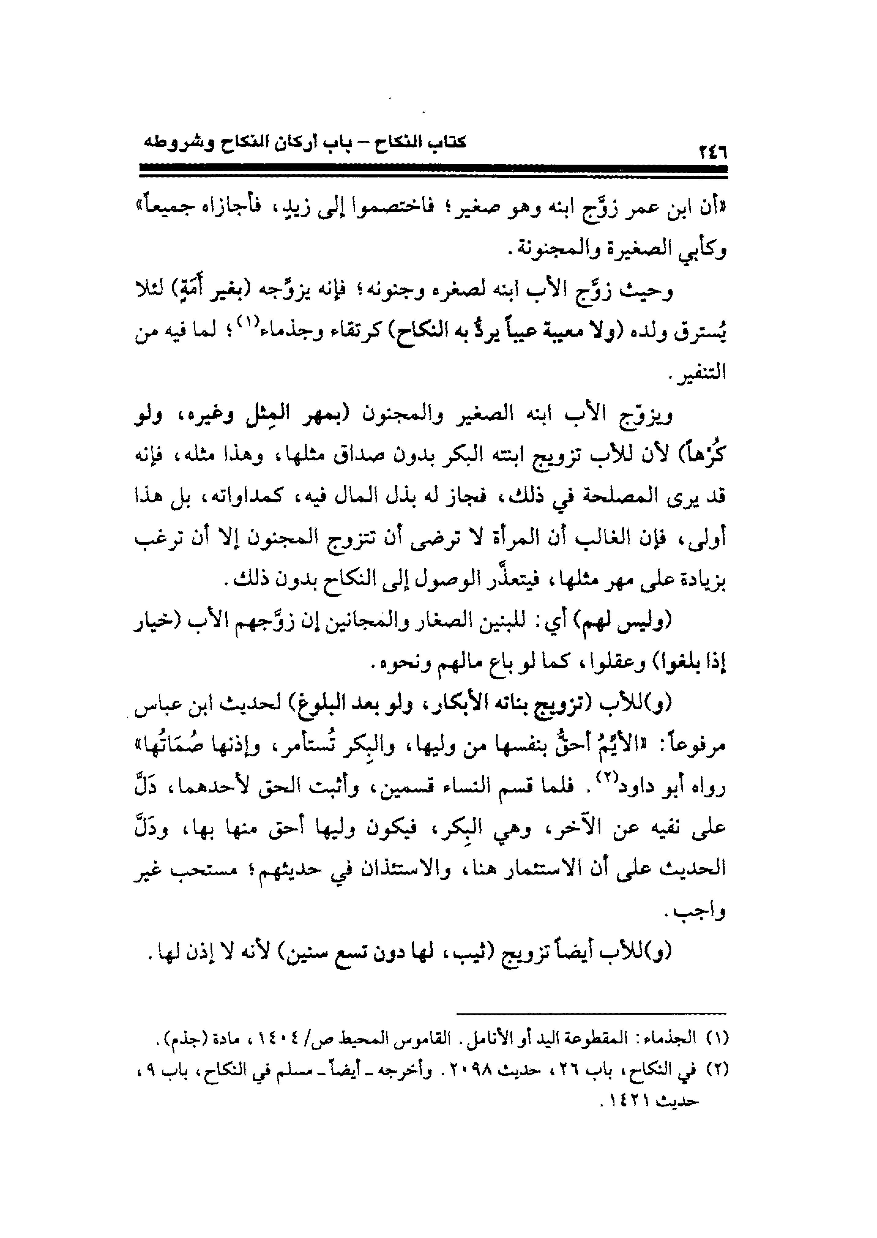 "أن ابن عمر زوّج ابنه وهو صغير؛ فاختصموا إلى زيد، فأجازاه جميعًا" وكأبي الصغيرة والمجنونة.