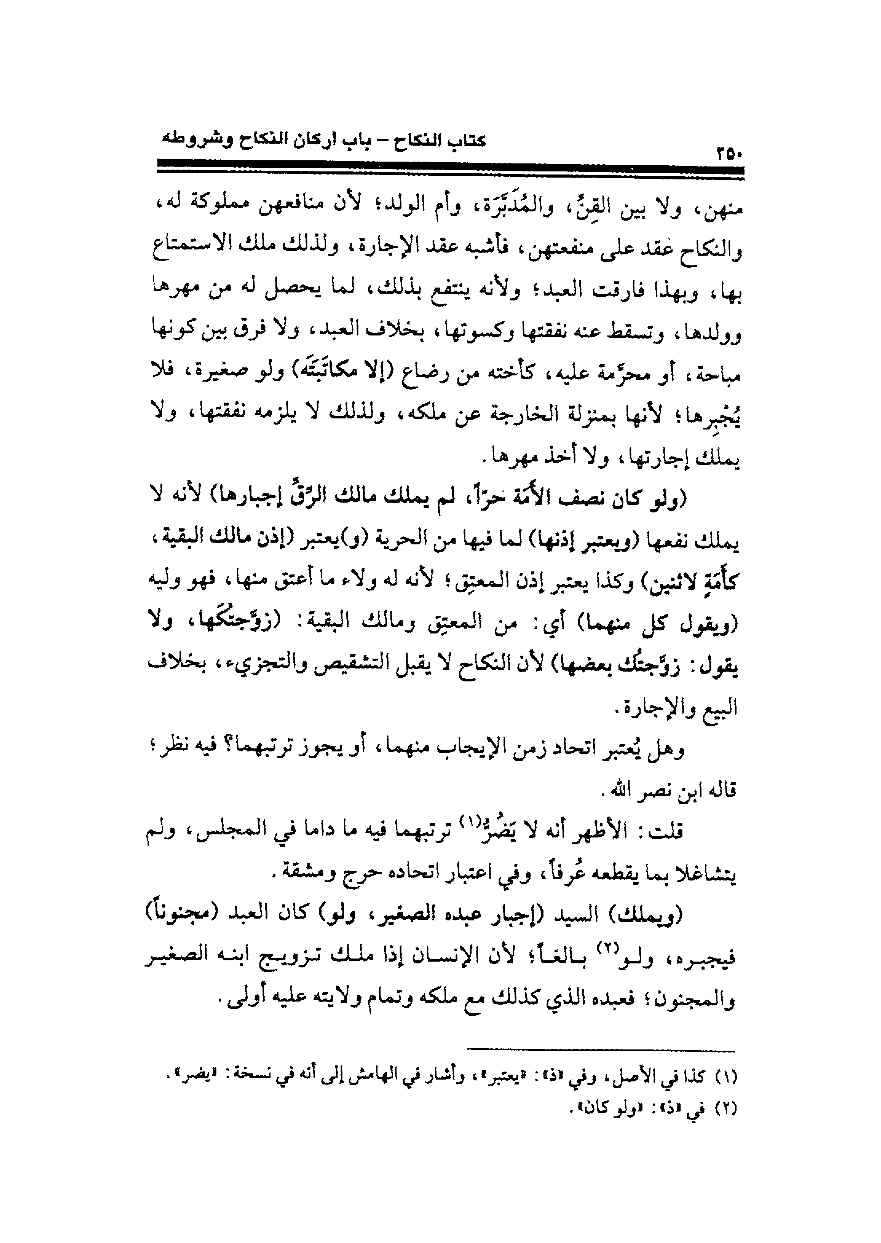 منهن، ولا بين القِنَّ، والمُدَبَّرَة، وأم الولد؛ لأن منافعهن مملوكة له، والنِّكَاح عقد على منفعتهن، فأشبه عقد الإجارة، ولذلك ملك الاستمتاع بها، وبهذا فارقت العبد؛ ولأنه ينتفع بذلك، لما يحصل له من مهرها وولدها، و تسقط عنه نفقتها وكسوتها، بخلاف العبد، و لا فرق بينكونها مباحة، أو محرَّمة عليه، كأخته من رضاع (إلا مكاتَبَتَه) ولو صغيرة، فلا يُجْبِرها؛ لأنها بمنزلة الخارجة عن ملكه، ولذلك لا يلزمه نفقتها، ولا يملك إجارتها، ولا أخذ مهرها.