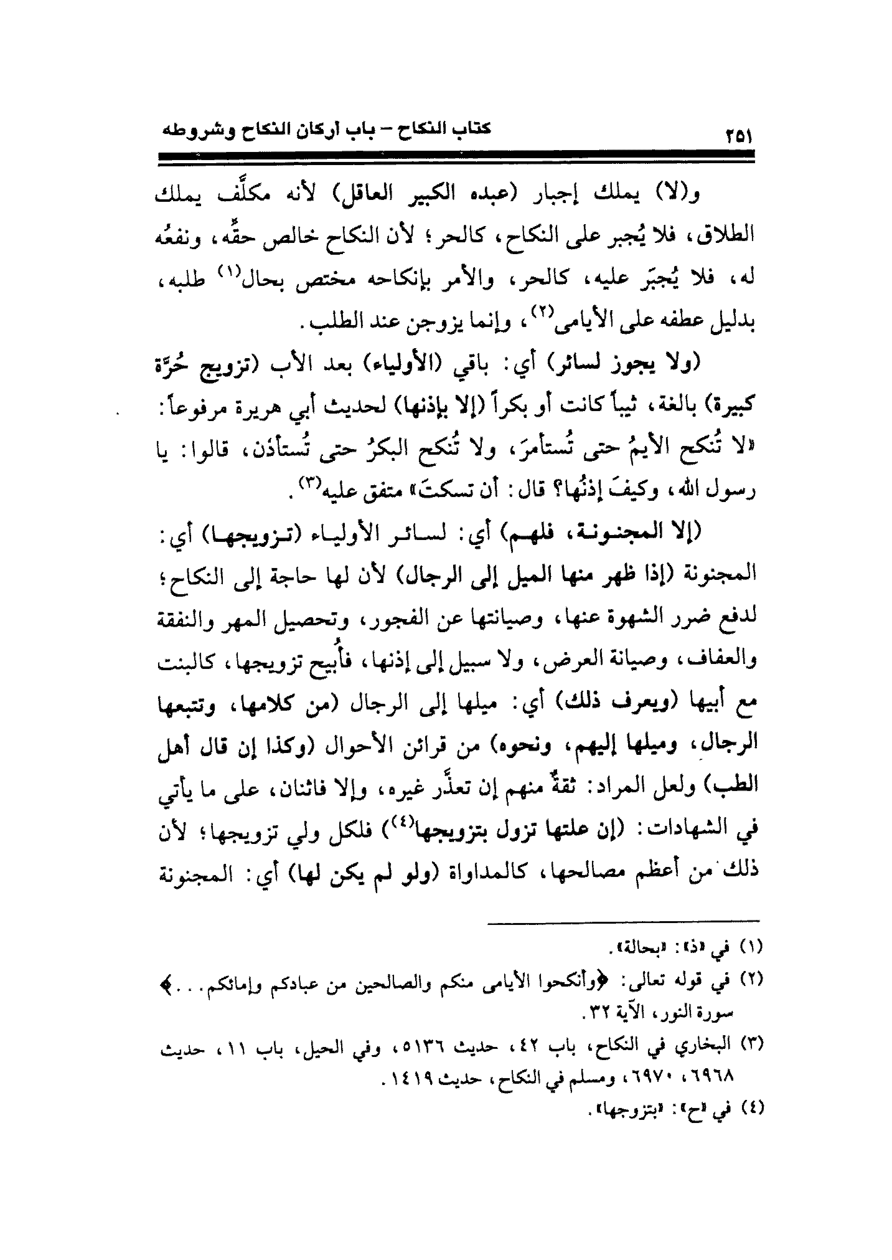 و (لا) يملك إجبار (عبده الكبير العاقل) لأنه مكلَّف يملك الطلاق، فلا يُجبر على النِّكَاح، كالحر؛ لأن النِّكَاح خالص حقِّه، ونفعُه له، فلا يُجبر عليه، كالحر، والأمر بإنكاحه مختص بحال (¬١) طلبه، بدليل عطفه على الأيامى (¬٢)، وإنما يزوجن عند الطلب.
