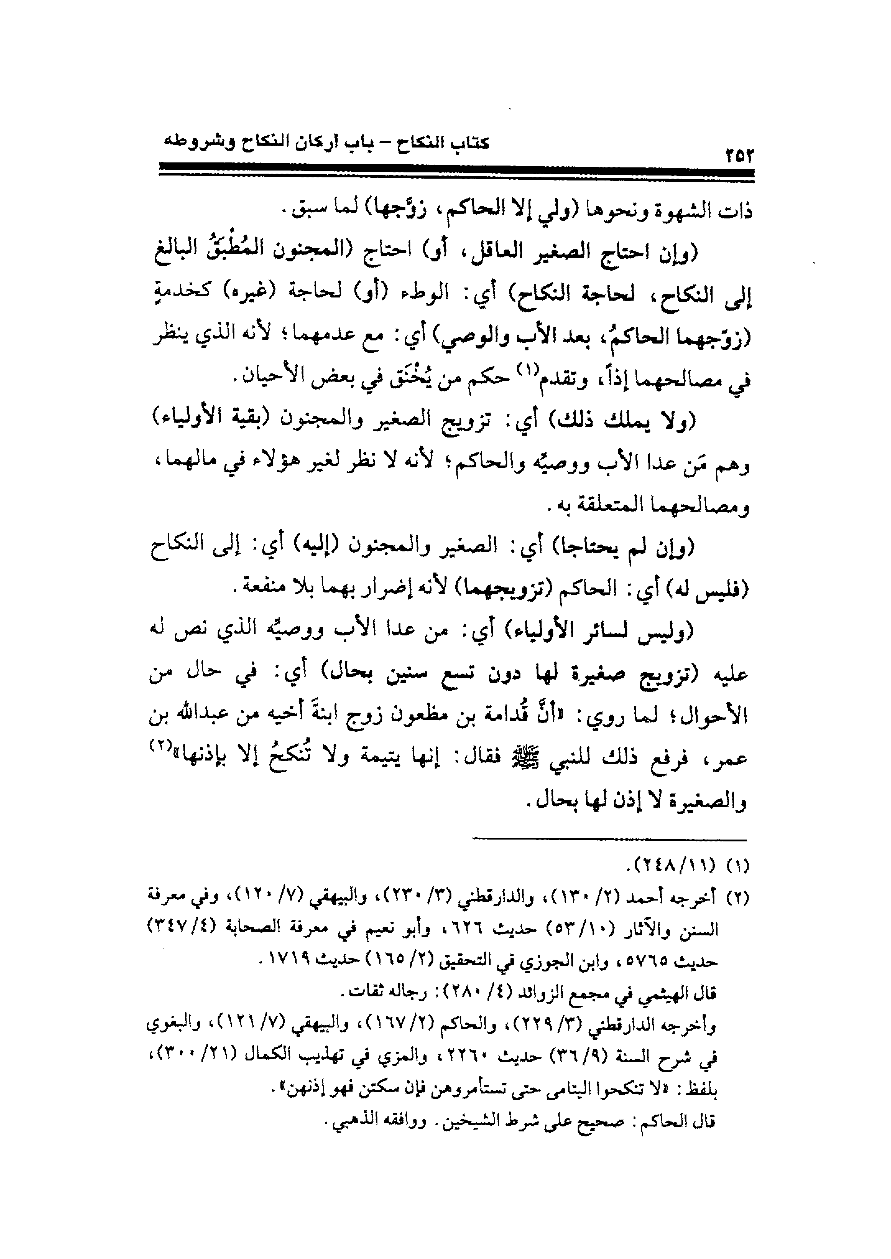 (وليس لسائر الأولياء) أي: من عدا الأب ووصيِّه الَّذي نص له عليه (تزويج صغيرة لها دون تسع سنين بحال) أي: في حال من الأحوال؛ لما روي: "أنَّ قُدامة بن مظعون زوج ابنةَ أخيه من عبد الله بن عمر، فرفع ذلك للنبي - صلى الله عليه وسلم - فقال: إنها يتيمة ولا تُنكحُ إلا بإذنها" (¬٢) والصغيرة لا إذن لها بحال.