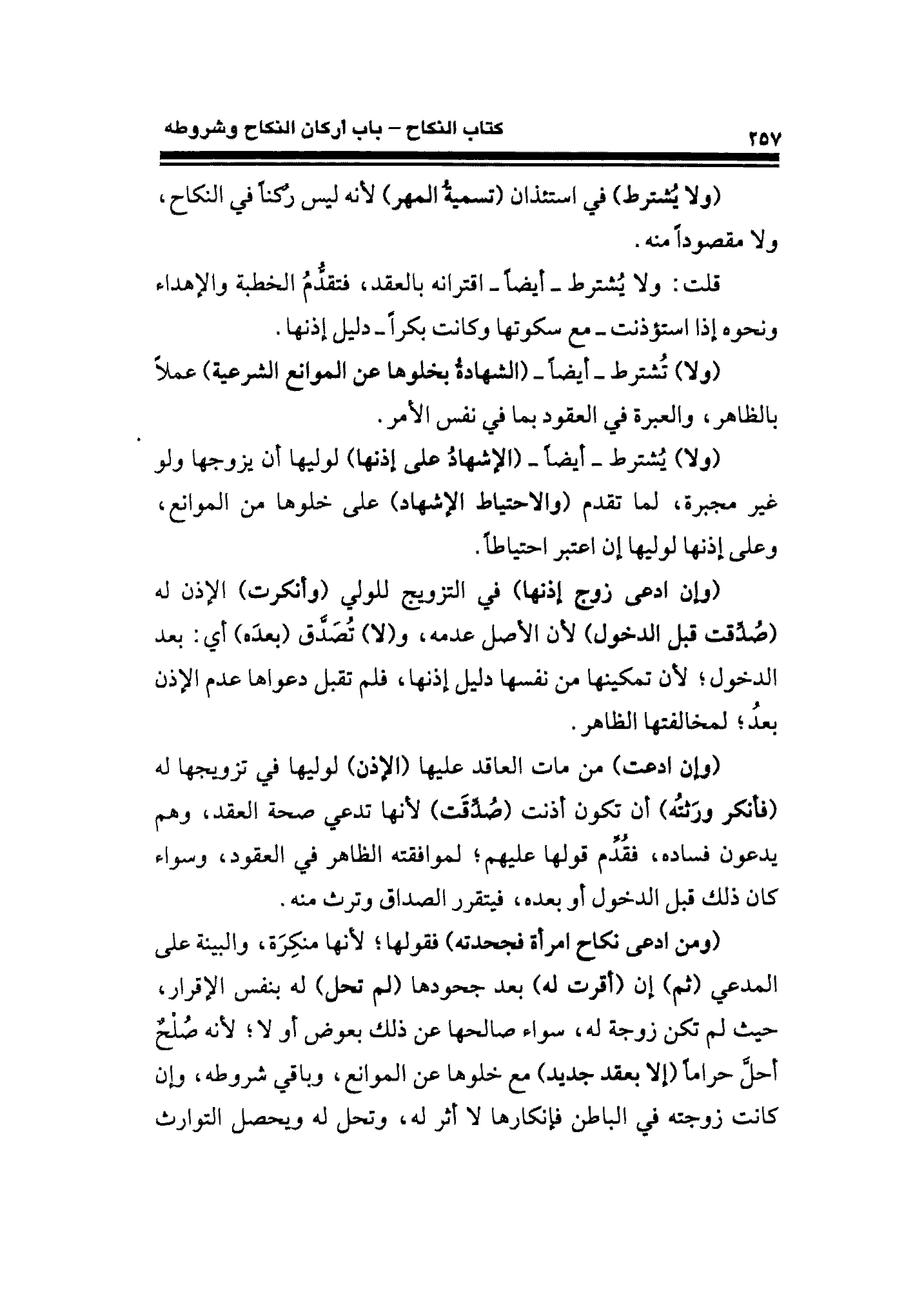 (ولا) يُشترط -أيضًا- (الإشهادُ على إذنها) لوليها أن يزوجها ولو غير مجبرة لما تقدم (والاحتياط الإشهاد) على خلوها من الموانع، وعلى إذنها لوليها إن اعتبر احتياطًا.