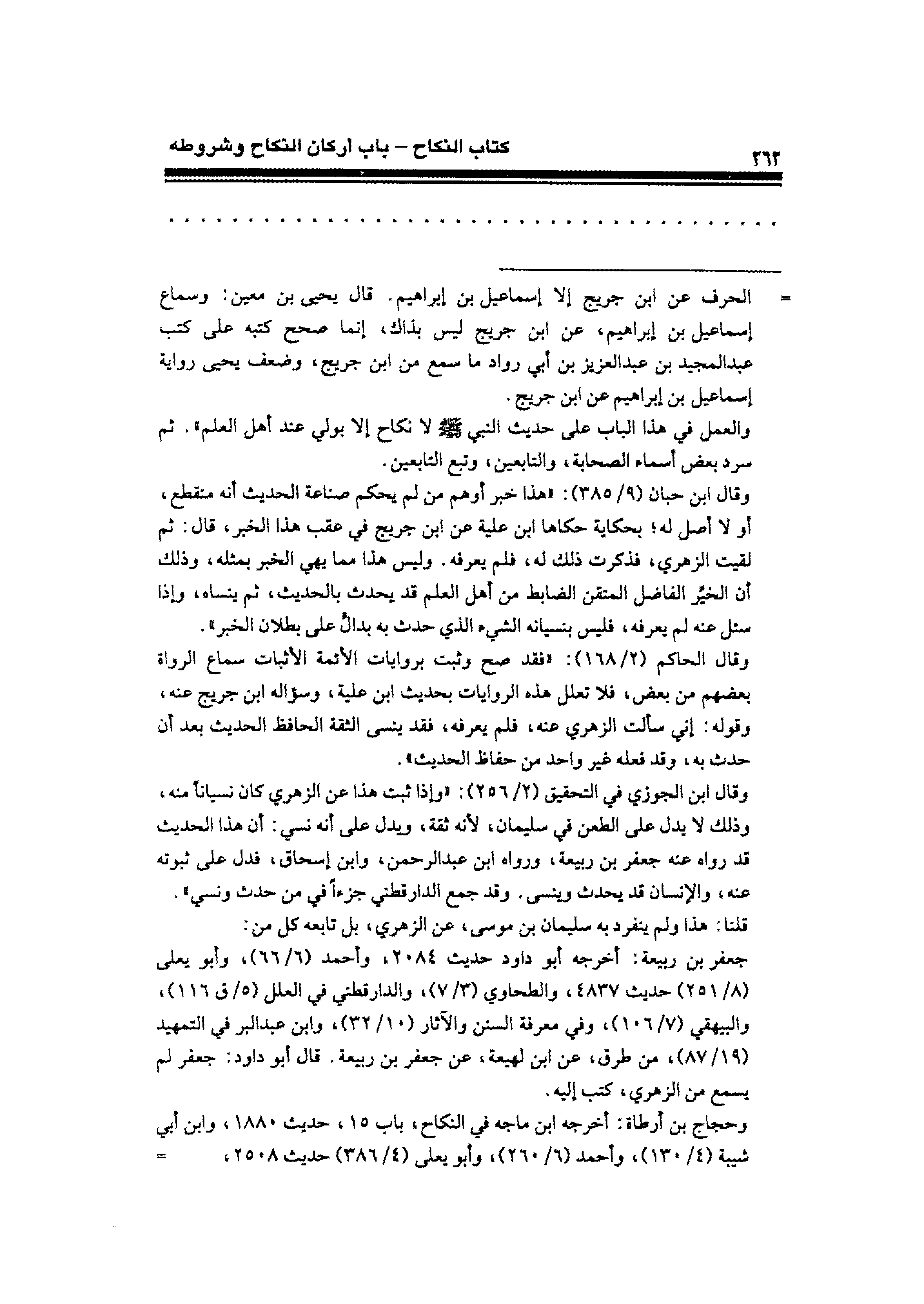 وقال ابن الجوزى في التحقيق (٢/ ٢٥٦): "وإذا ثبت هذا عن الزهريّ كان نسيانًا منه، وذلك لا يدل على الطعن في سليمان، لأنه ثقة، ويدل على أنه نسي: أن هذا الحديث قد رواه عنه جعفر بن ربيعة، ورواه ابن عبد الرحمن، وابن إسحاق، فدل على ثبوته عنه، والإنسان قد يحدث وينسى. وقد جمع الدارقطني جزءًا في من حدث ونسي".