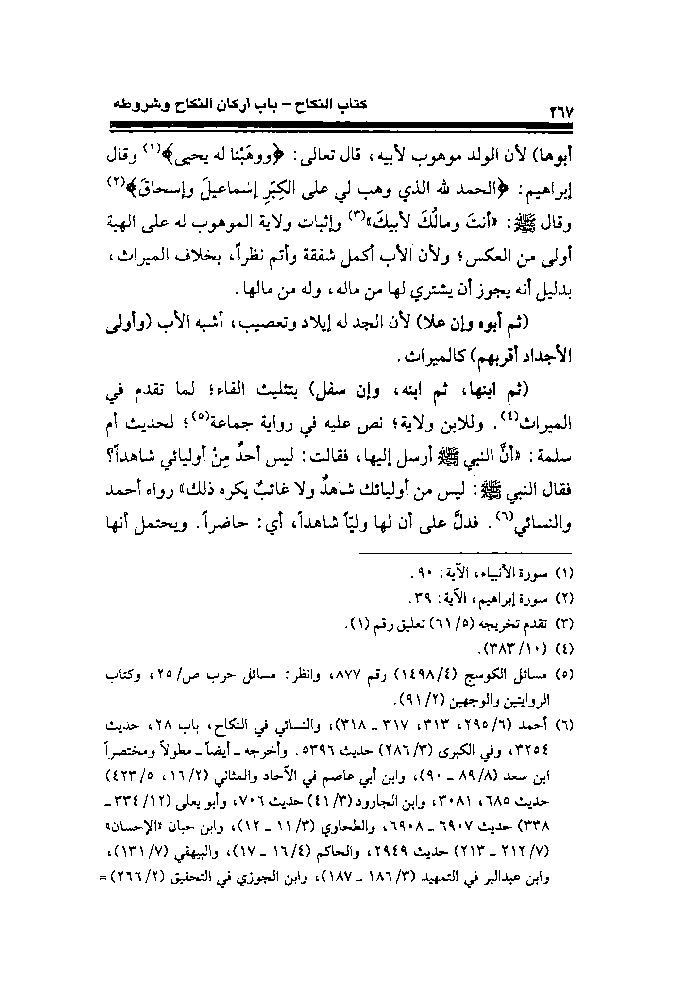 (ثم ابنها، ثم ابنه، وإن سفل) بتثليث الفاء؛ لما تقدم في الميراث (¬٤). وللابن ولاية؛ نص عليه في رواية جماعة (¬٥)؛ لحديث أم سلمة: "أن النبي -صلى الله عليه وسلم- أرسل إليها، فقالت: ليس أحدٌ مِنْ أوليائي شاهدًا؟ فقال النبي -صلى الله عليه وسلم-: ليس من أوليائك شاهدٌ ولا غائبٌ يكره ذلك" رواه أحمد والنسائي (¬٦). فدلَّ على أن لها وليًّا شاهدًا، أي: حاضرًا. ويحتمل أنها