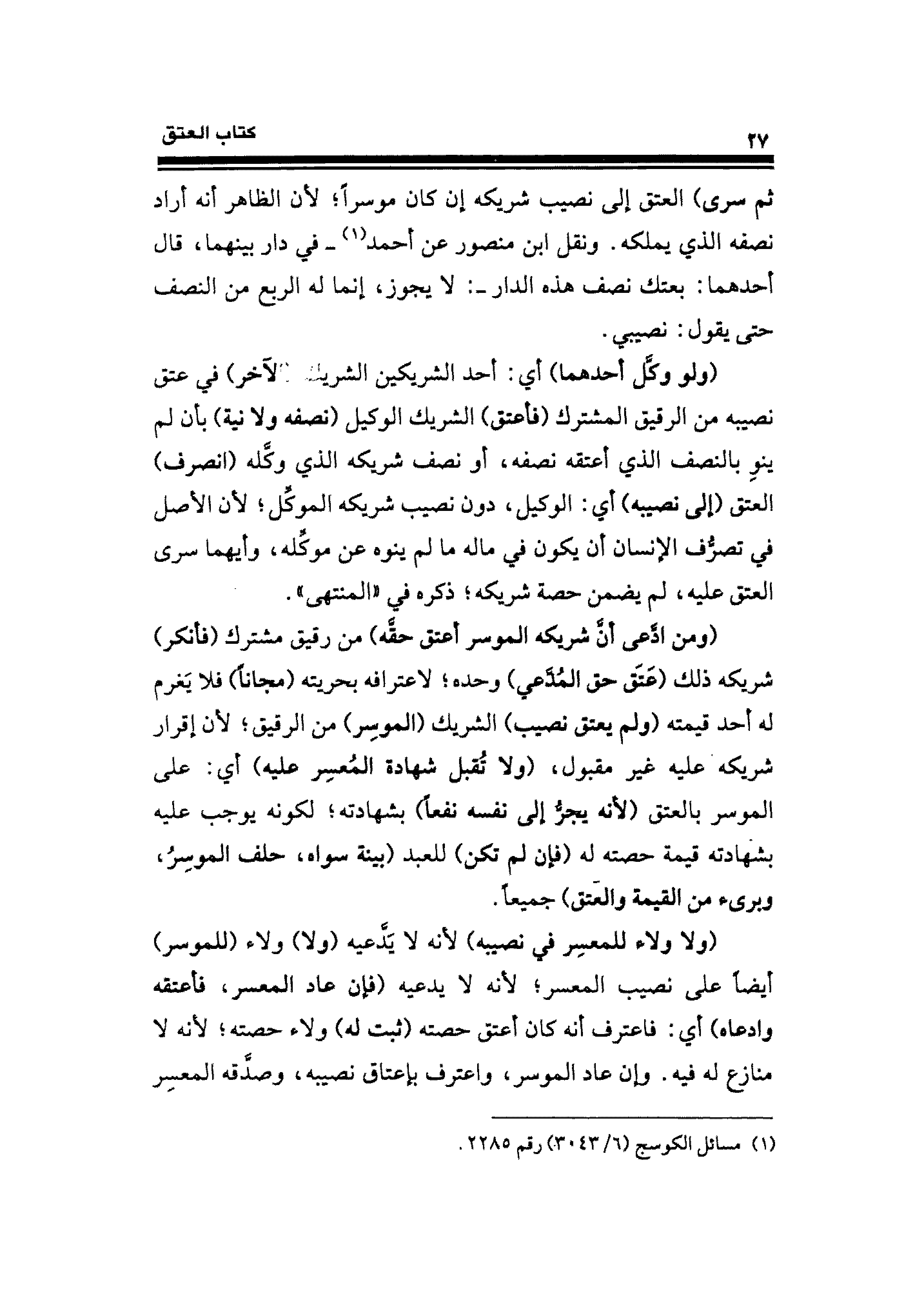 ثم سرى) العتق إلى نصيب شريكه إن كان موسرًا؛ لأن الظاهر أنه أراد نصفه الذي يملكه. ونقل ابن منصور عن أحمد (¬١) -في دار بينهما، قال أحدهما: بعتك نصف هذه الدار-: لا يجوز، إنما له الربع من النصف حتى يقول: نصيبي.