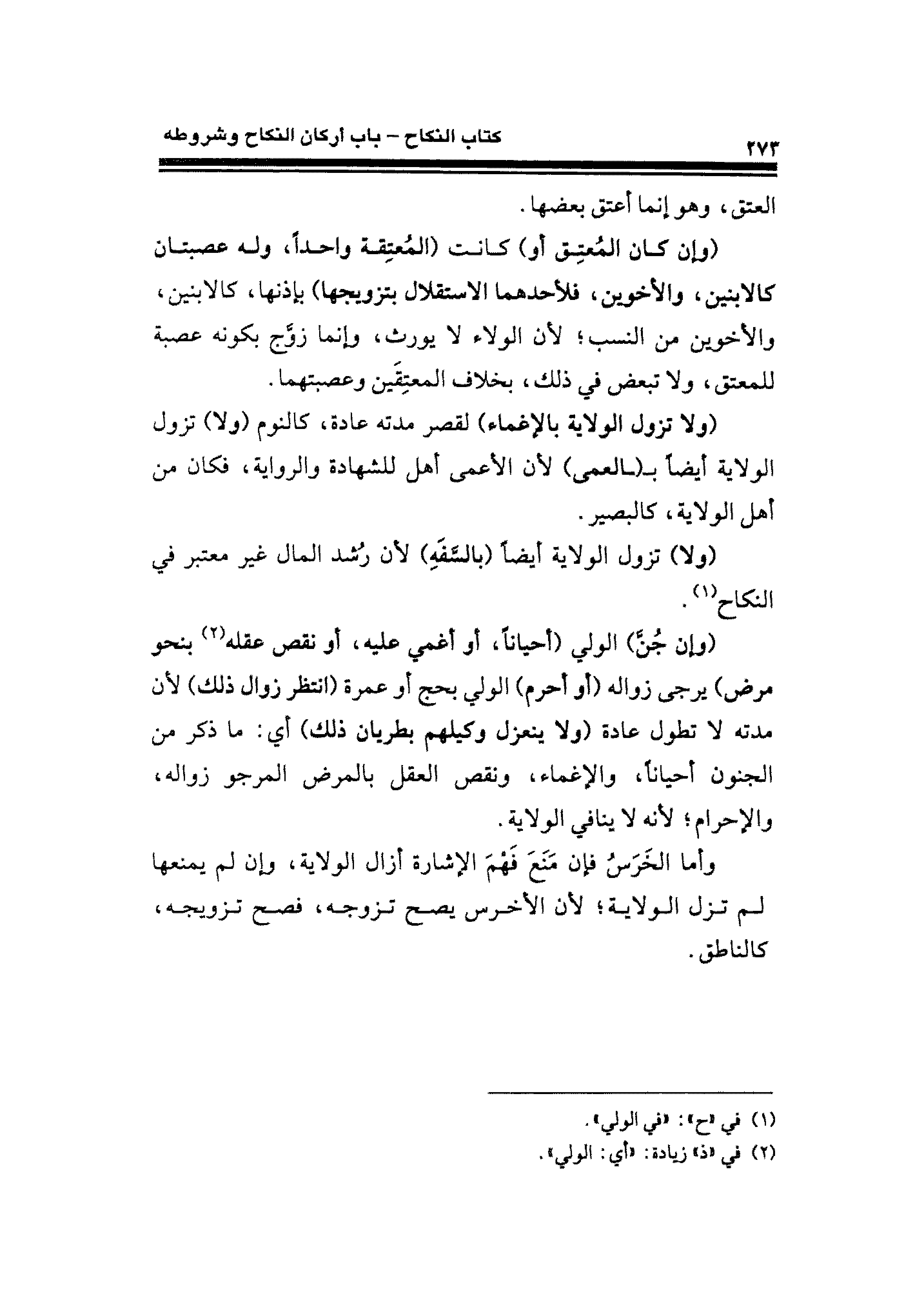 (ولا تزول الولاية بالإغماء) لقصر مدته عادة، كالنوم (ولا) تزول الولاية أيضًا بـ (ـالعمى) لأن الأعمى أهل للشهادة والرواية، فكان من أهل الولاية، كالبصير.