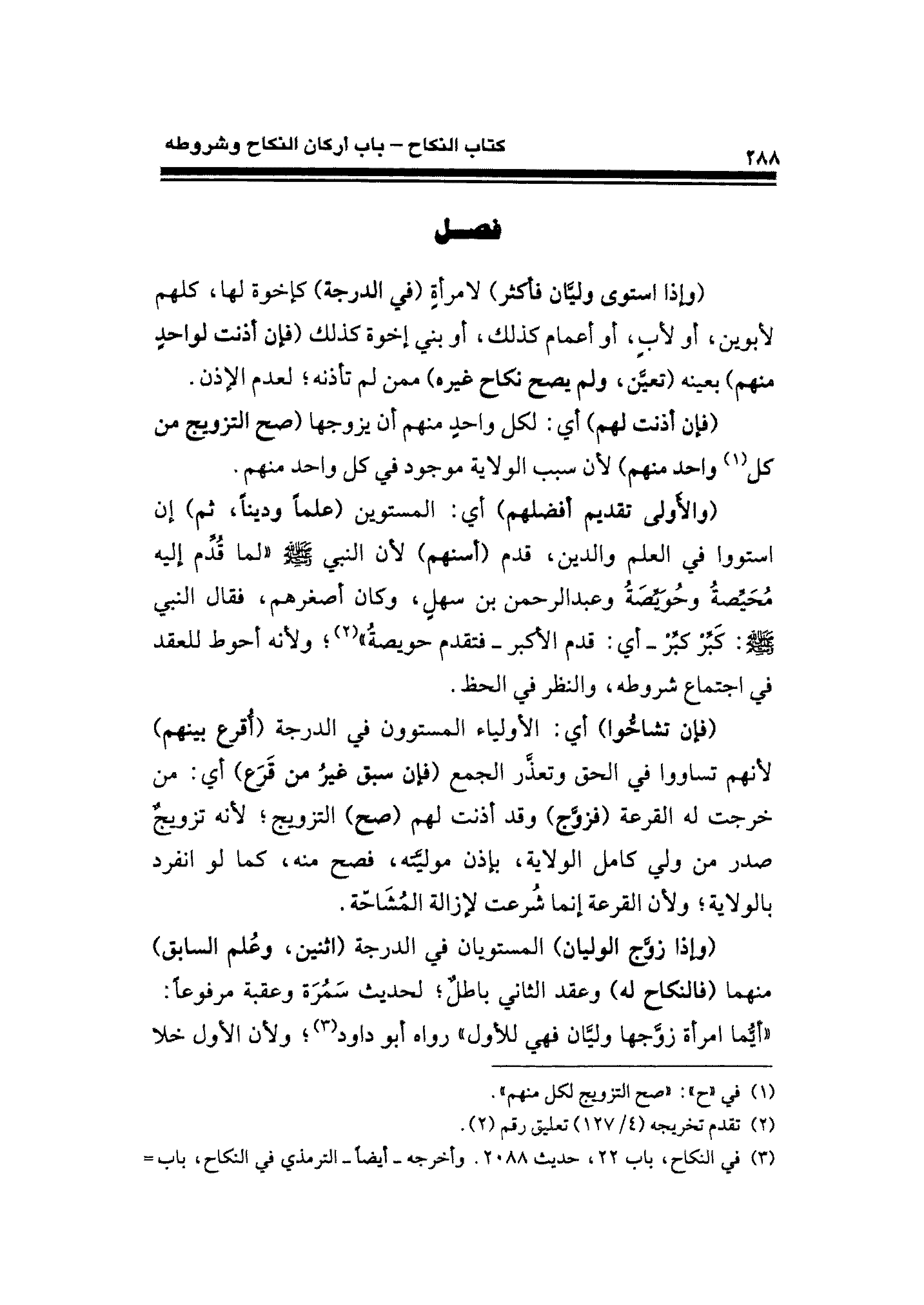 (وإذا استوى وليَّان فأكثر) لامرأةٍ (في الدرجة) كإخوة لها، كلهم لأبوين، أو لأبٍ، أو أعمام كذلك، أو بني إخوة كذلك (فإن أذنت لواحدٍ منهم) بعينه (تعيَّن، ولم يصح نكاح غيره) ممن لم تأذنه؛ لعدم الإذن.