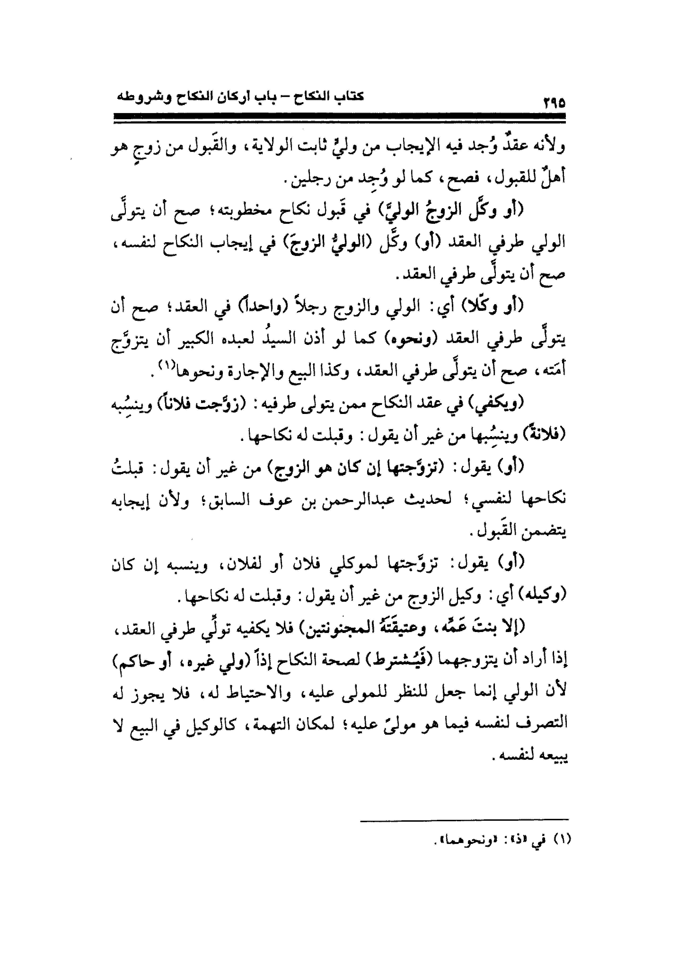 (أو وكَّل الزوجُ الوليَّ) في قَبول نكاح مخطوبته؛ صح أن يتولَّى الولي طرفي العقد (أو) وكَّل (الوليُّ الزوجَ) في إيجاب النكاح لنفسه، صح أن يتولَّى طرفي العقد.