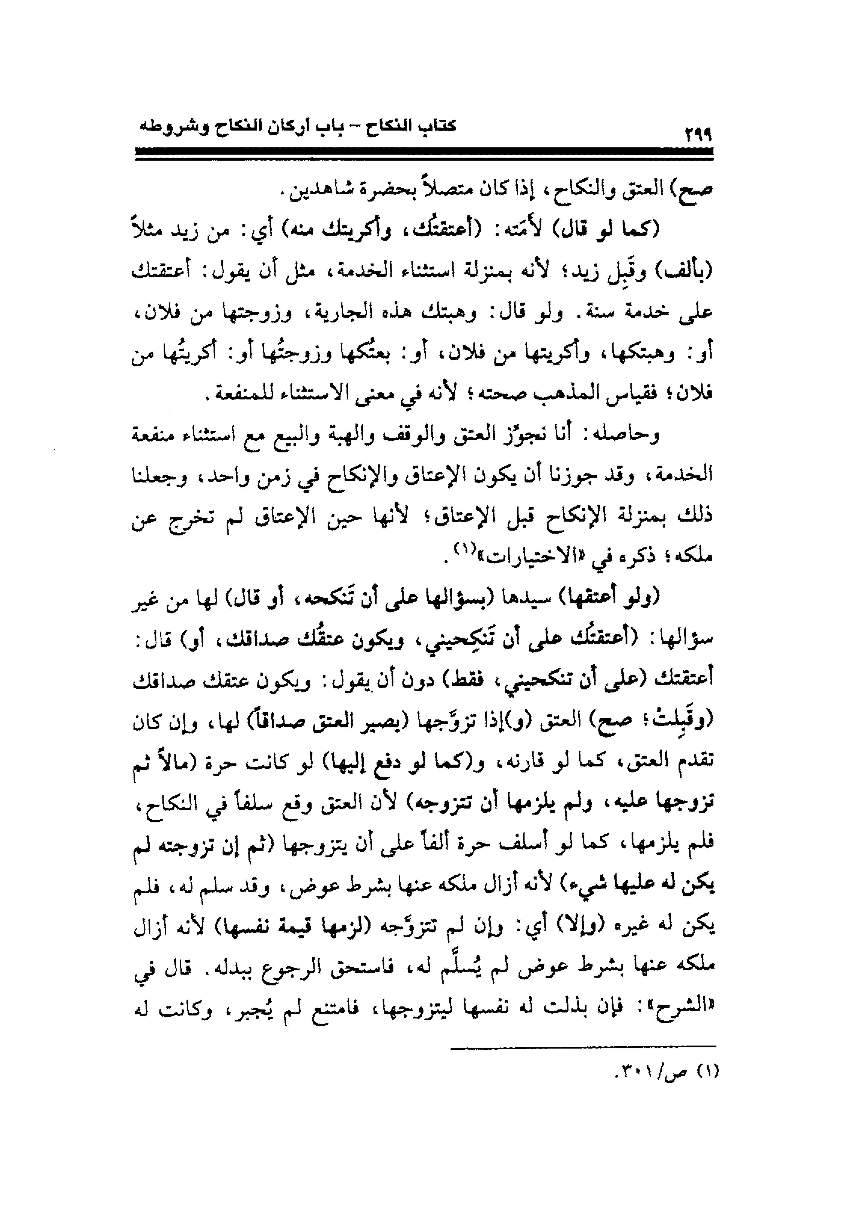 وحاصله: أنا نجوِّز العتق والوقف والهبة والبيع مع استثناء منفعة الخدمة، وقد جوزنا أن يكون الإعتاق والإنكاح في زمن واحد، وجعلنا ذلك بمنزلة الإنكاح قبل الأعتاق؛ لأنها حين الإعتاق لم تخرج عن ملكه؛ ذكره في "الاختيارات" (¬١).