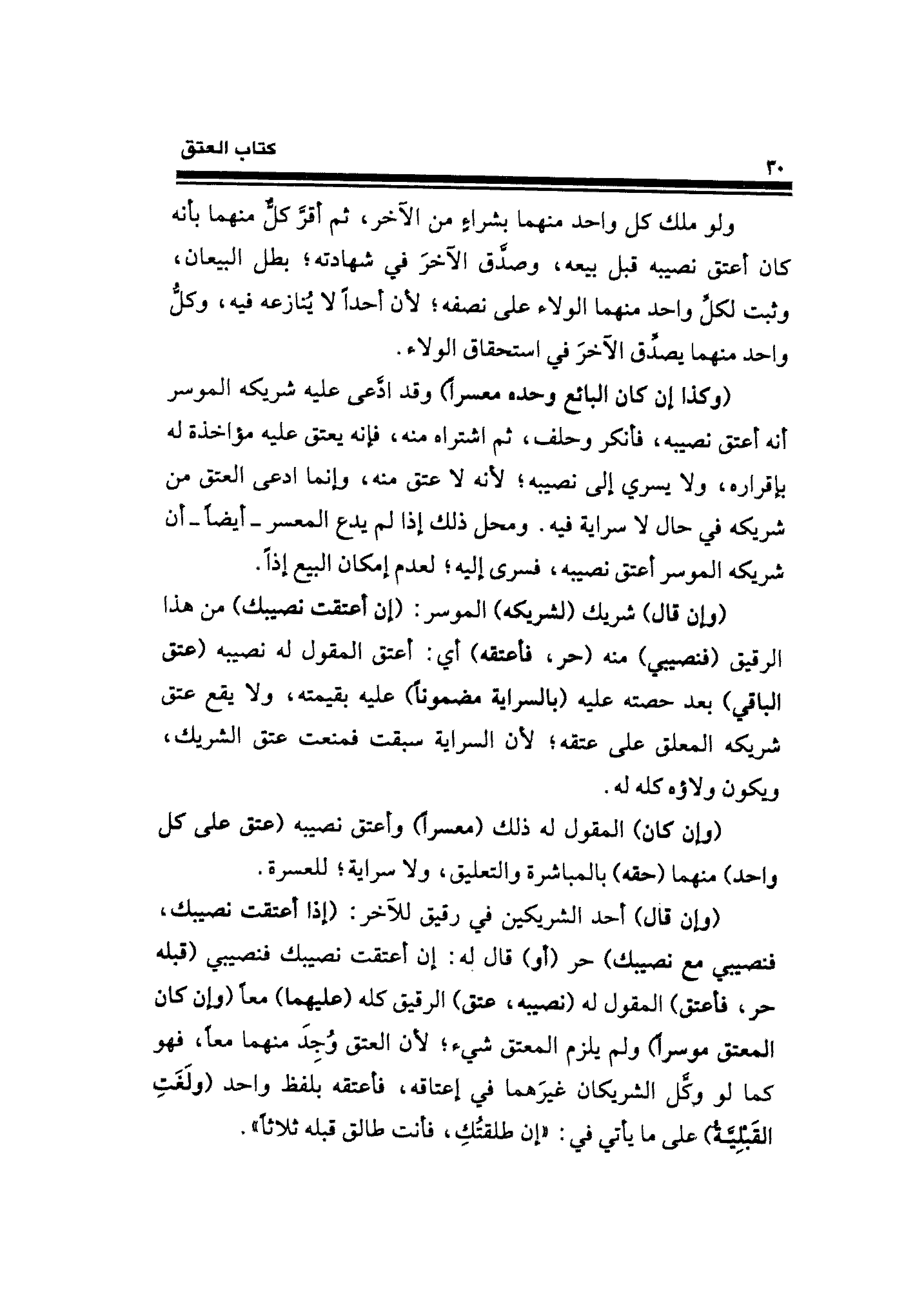 (وكذا إن كان البائع وحده معسرًا) وقد ادَّعى عليه شريكه الموسر أنه أعتق نصيبه، فأنكر وحلف، ثم اشتراه منه، فإنه يعتق عليه مؤاخذة له بإقراره، ولا يسري إلى نصيبه؛ لأنه لا عتق منه، وإنما ادعى العتق من شريكه في حال لا سراية فيه. ومحل ذلك إذا لم يدع المعسر -أيضًا- أن شريكه الموسر أعتق نصيبه، فسرى إليه؛ لعدم إمكان البيع إذًا.