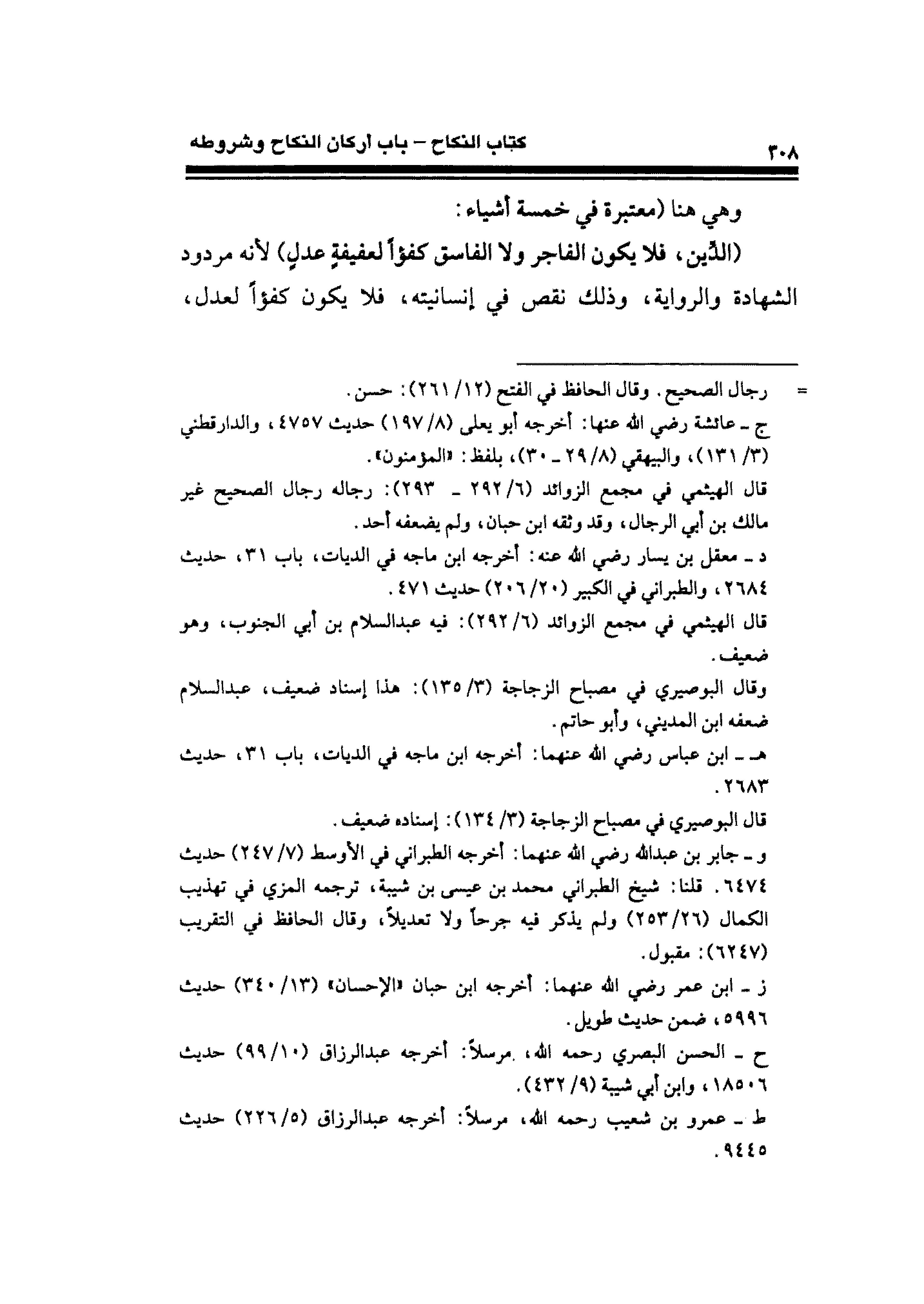 (الدِّين، فلا يكون الفاجر ولا الفاسق كفؤًا لعفيفةٍ عدلٍ) لأنه مردود الشهادة والرواية، وذلك نقص في إنسانيته، فلا يكون كفؤًا لعدل،