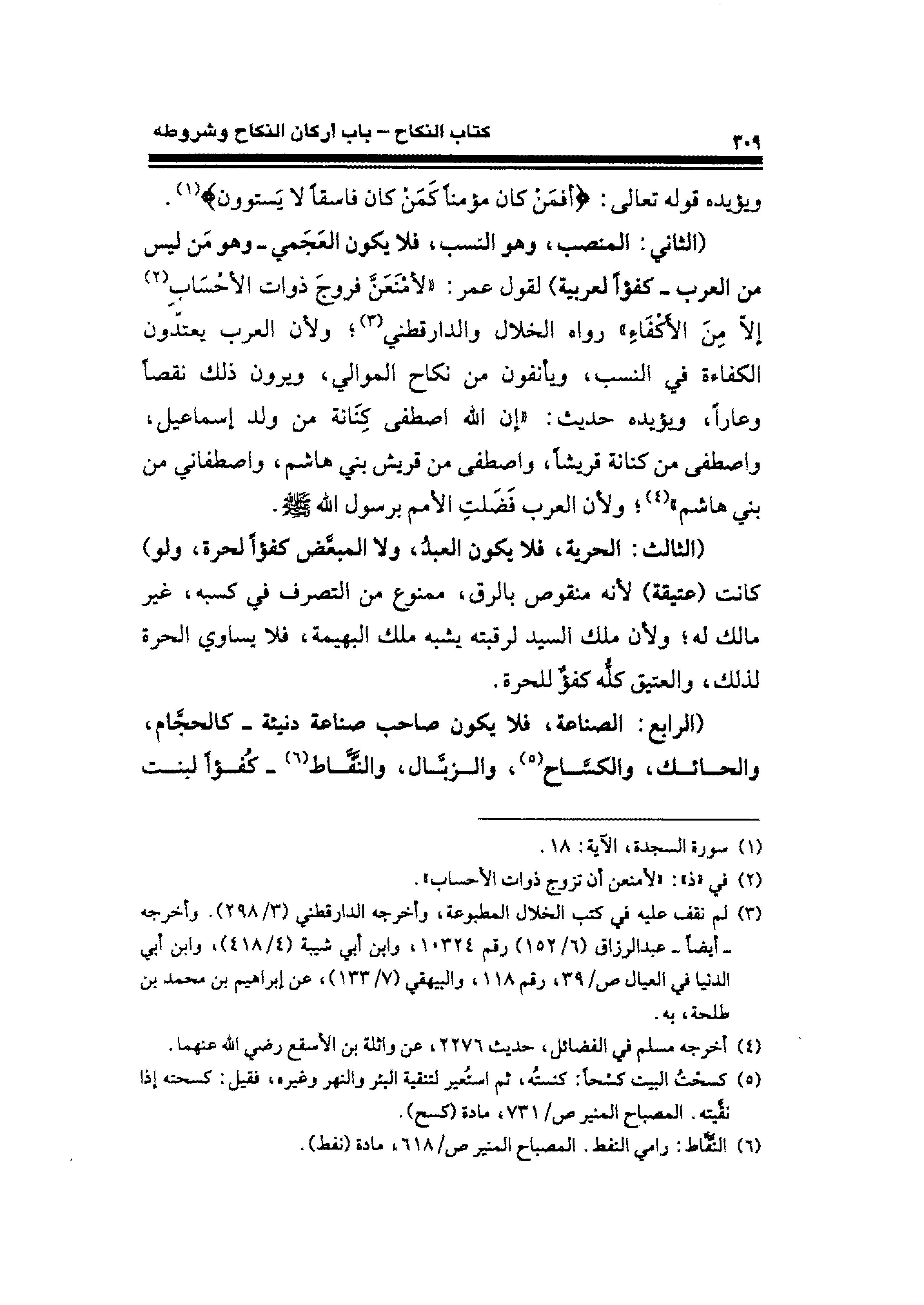 (الثاني: المنصب، وهو النسب، فلا يكون العَجَمي -وهو مَن ليس من العرب- كفؤًا لعربية) لقول عمر: "لأمْتَعَن فروجَ ذوات الأحْسَابِ (¬٢) إلاّ مِنَ الأَكْفَاء" رواه الخلال والدارقطنى (¬٣)؛ ولأن العرب يعتدّون الكفاءة في النسب، ويأنفون من نكاح الموالي، ويرون ذلك نقصًا وعارًا، ويؤيده حديث: "إن الله اصطفى كِنَانة من ولد إسماعيل، واصطفى من كنانة قريشًا، واصطفى من قريش بني هاشم، واصطفاني من بني هاشم" (¬٤)؛ ولأن العرب فَضَلتِ الأمم برسول - صلى الله عليه وسلم -.