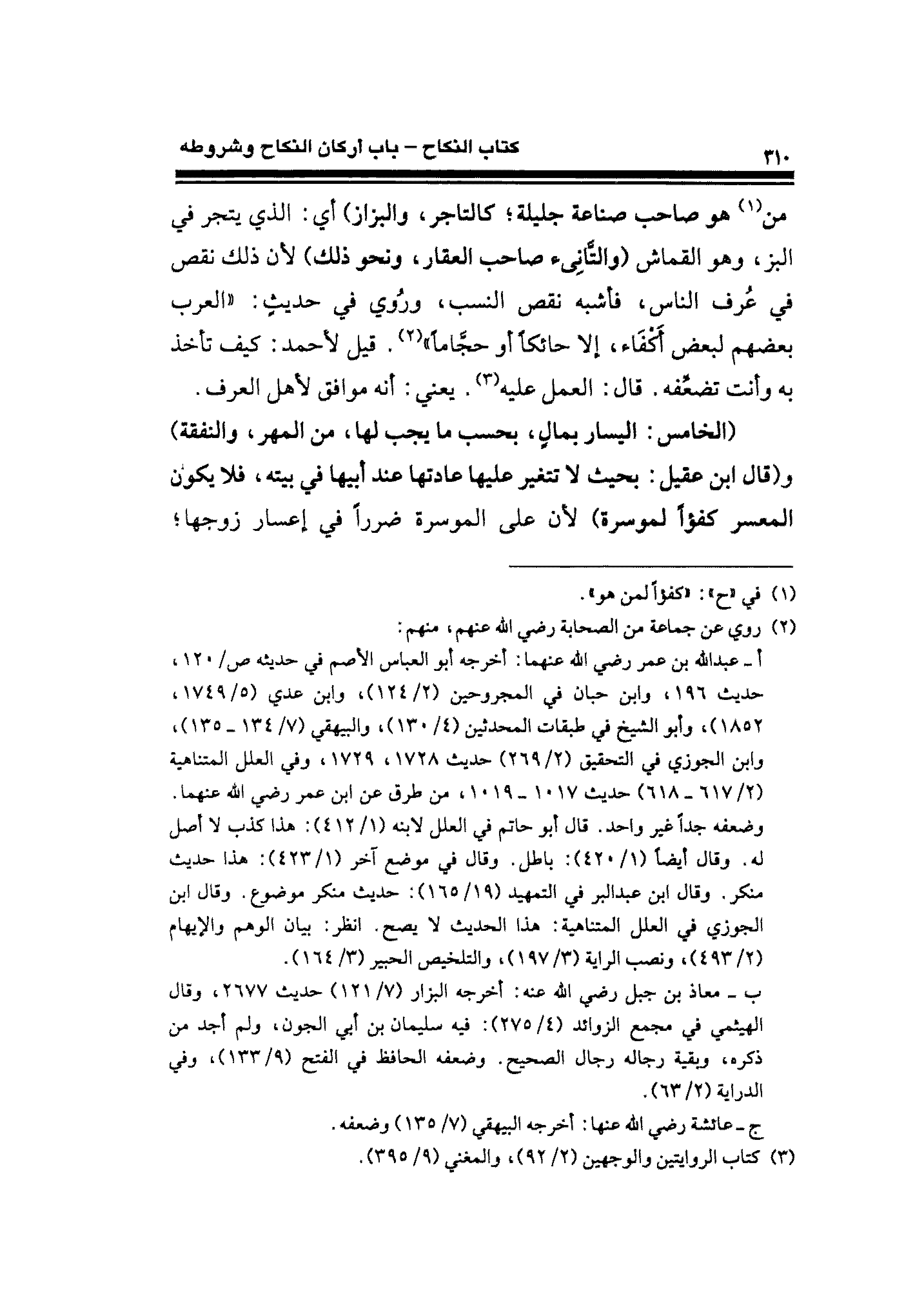 من (¬١) هو صاحب صناعة جليلة؛ كالتاجر، والبزاز) أي: الذي يتجر في البز، وهو القماش (والتَّانِئ صاحب العقار، ونحو ذلك) لأن ذلك نقص في عُرف الناس، فأشبه نقص النسب، ورُوي في حديثٍ: "العرب بعضهم لبعض أَكْفَاء، إلا حائكًا أو حجَّامًا" (¬٢). قيل لأحمد: كيف تأخذ به وأنت تضعِّفه. قال: العمل عليه (¬٣). يعني: أنه موافق لأهل العرف.
