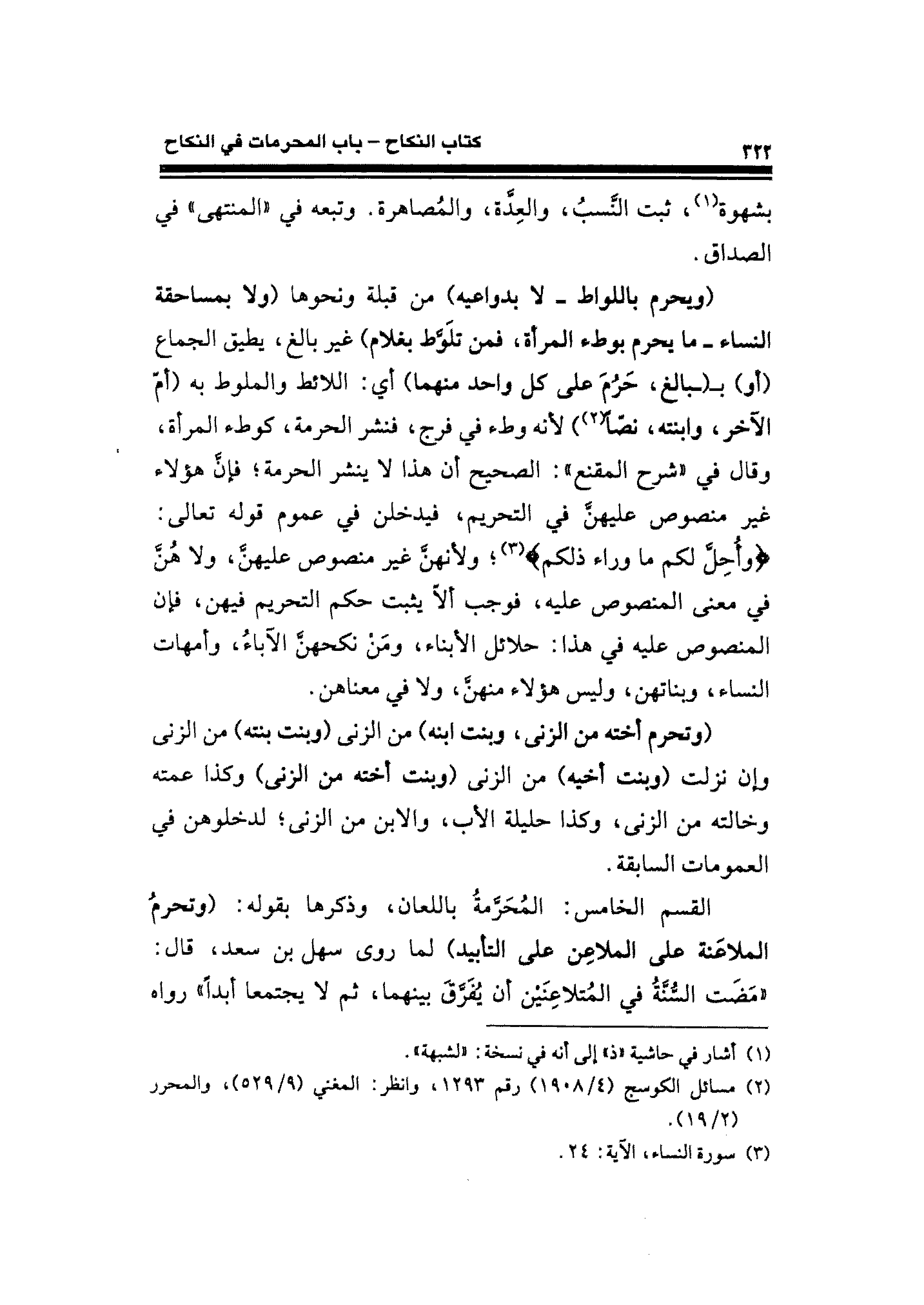 (ويحرم باللواط -لا بدواعيه) من قبلة ونحوها (ولا بمساحقة النساء- ما يحرم بوطء المرأة، فمن تلَوَّط بغلام) غير بالغ، يطيق الجماع (أو) بـ (ـبالغ، حَرُمَ على كل واحد منهما) أي: اللائط والملوط به (أمّ الآخر، وابنته، نصًا (¬٢)) لأنه وطء في فرج، فنشر الحرمة، كوطء المرأة، وقال في "شرح المقنع": الصحيح أن هذا لا ينشر الحرمة؛ فإنَّ هؤلاء غير منصوص عليهنَّ في التحريم، فيدخلن في عموم قوله تعالى: {وأُحِلَّ لكم ما وراء ذلكم} (¬٣)؛ ولأنهن غير منصوص عليهنَّ، ولا هُنَّ في معنى المنصوص عليه، فوجب ألَّا يثبت حكم التحريم فيهن، فإن المنصوص عليه في هذا: حلائل الأبناء، ومَنْ نكحهنَّ الآباءُ، وأمهات النساء، وبناتهن، وليس هؤلاء منهنَّ، ولا في معناهن.