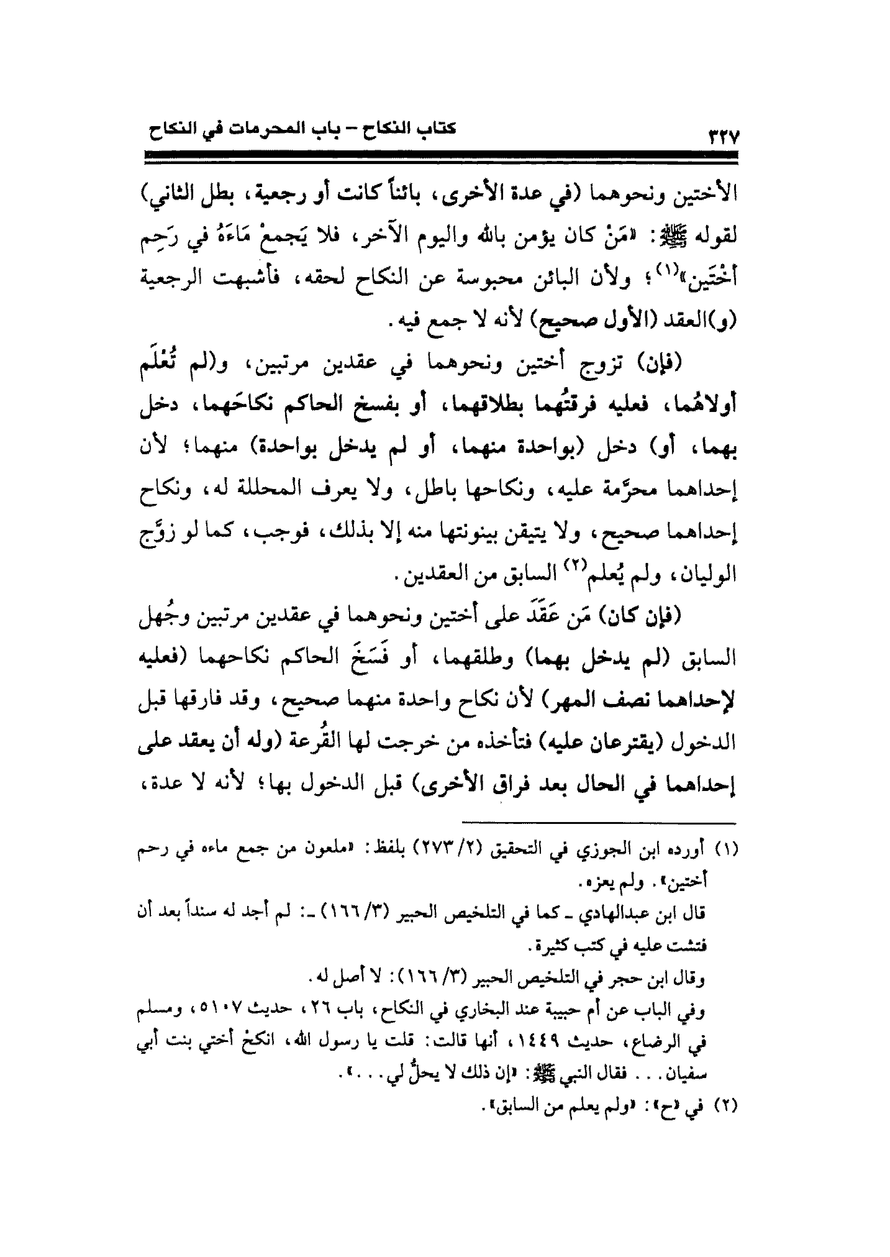 الأختين ونحوهما (في عدة الأخرى، بائنًا كانت أو رجعية، بطل الثاني) لقوله - صلى الله عليه وسلم -: "مَنْ كان يؤمن بالله واليوم الآخر، فلا يَجمعْ مَاءَهُ في رَحِم أخْتَين" (¬١)؛ ولأن البائن محبوسة عن النكاح لحقه، فأشبهت الرجعية (و) العقد (الأول صحيح) لأنه لا جمع فيه.