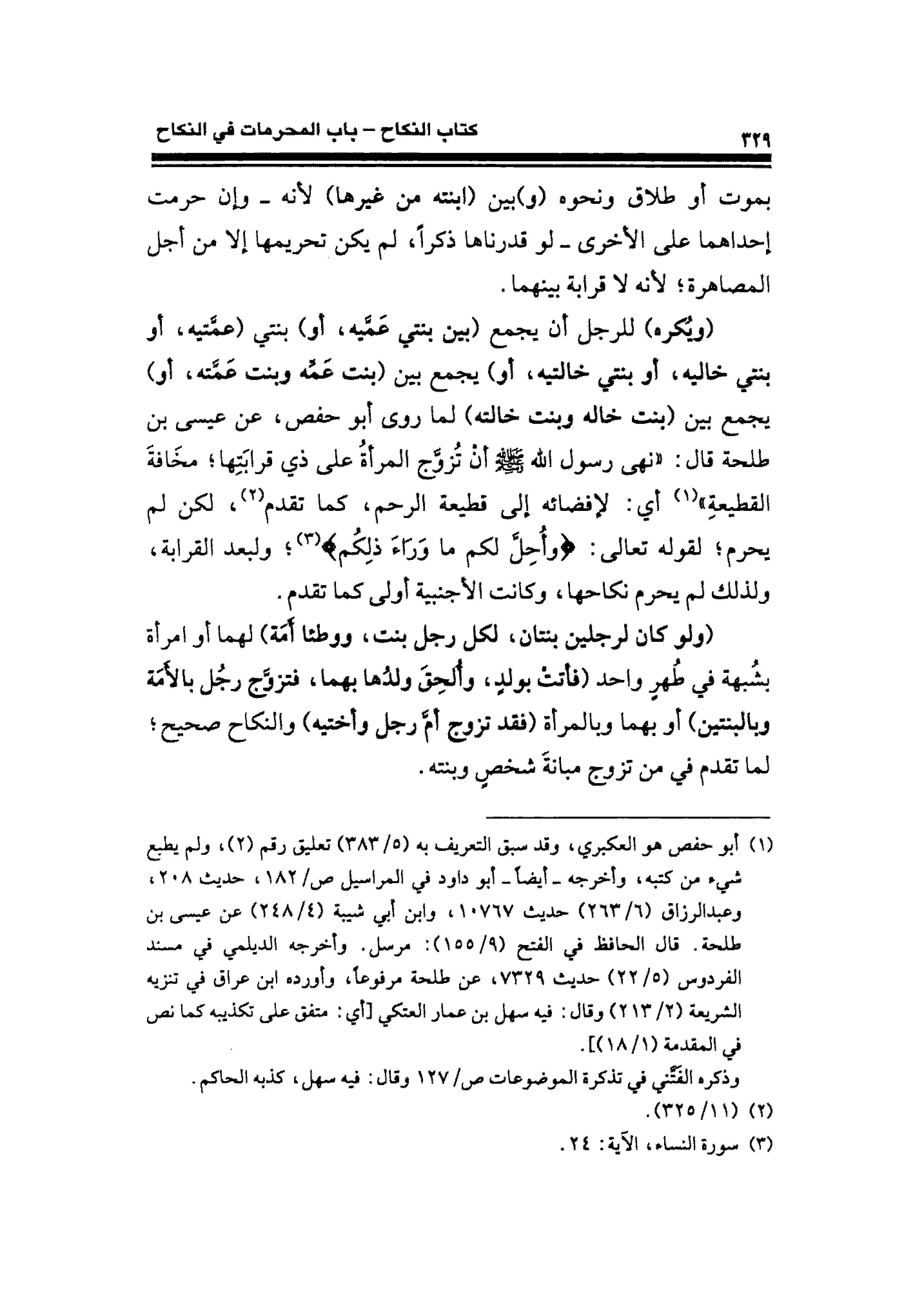(ويُكره) للرجل أن يجمع (بين بنتي عَمَّيه، أو) بنتي (عمَّتيه، أو بنتي خاليه، أو بنتي خالتيه، أو) يجمع بين (بنت عَمِّه وبنت عَمَّته، أو) يجمع بين بنت خاله وبنت خالته) لما روى أبو حفص، عن عيسى بن طلحة قال: "نهى رسول الله - صلى الله عليه وسلم - أن تُزوَّج المرأةُ على ذي قرابَتِها؟ مخَافةَ القطيعةِ" (¬١) أي: لإفضائه إلى قطيعة الرحم، كما تقدم (¬٢)، لكن لم يحرم؛ لقوله تعالى: {وأُحِلَّ لكلم ما وَراءَ ذلِكُم} (¬٣)؛ ولبعد القرابة، ولذلك لم يحرم نكاحها، وكانت الأجنبية أولى كما تقدم.