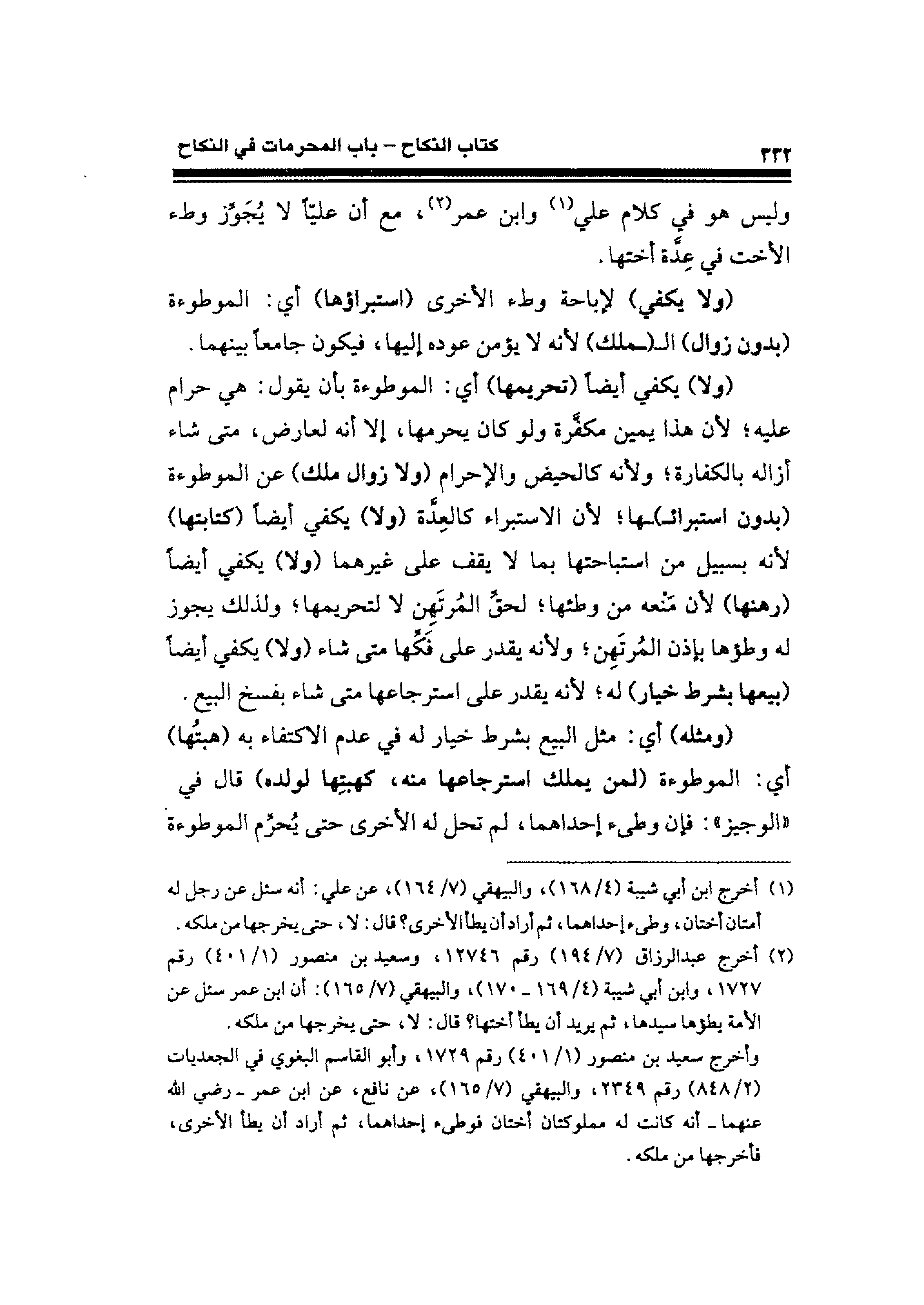 (¬٢) أخرج عبد الرزاق (٧/ ١٩٤) رقم ١٢٧٤٦، وسعيد بن منصور (١/ ٤٠١) رقم ١٧٢٧، وابن أبي شيبة (٤/ ١٦٩ - ١٧٠)، والبيهقي (٧/ ١٦٥): أن ابن عمر سئل عن الأمة يطؤها سيدها، ثم يريد أن يطأ أختها؟ قال: لا، حتى يخرجها من ملكه.