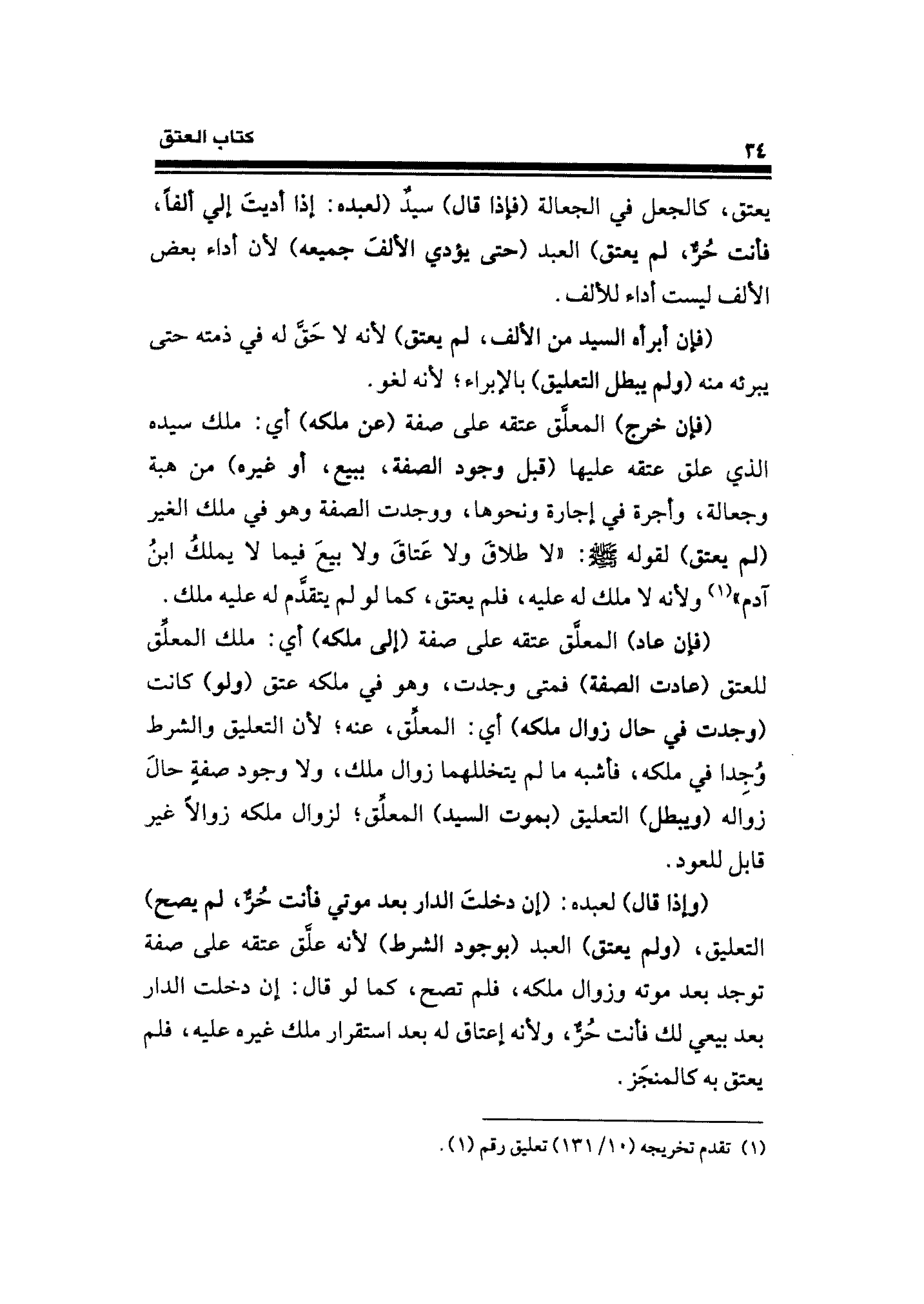 (فإن عاد) المعلَّق عتقه على صفة (إلى ملكه) أي: ملك المعلِّق للعتق (عادت الصفة) فمتى وجدت، وهو في ملكه عتق (ولو) كانت (وجدت في حال زوال ملكه) أي: المعلِّق، عنه؛ لأن التعليق والشرط وُجِدا في ملكه، فأشبه ما لم يتخللهما زوال ملك، ولا وجود صفةٍ حالَ زواله (ويبطل) التعليق (بموت السيد) المعلِّق؛ لزوال ملكه زوالًا غير قابل للعود.