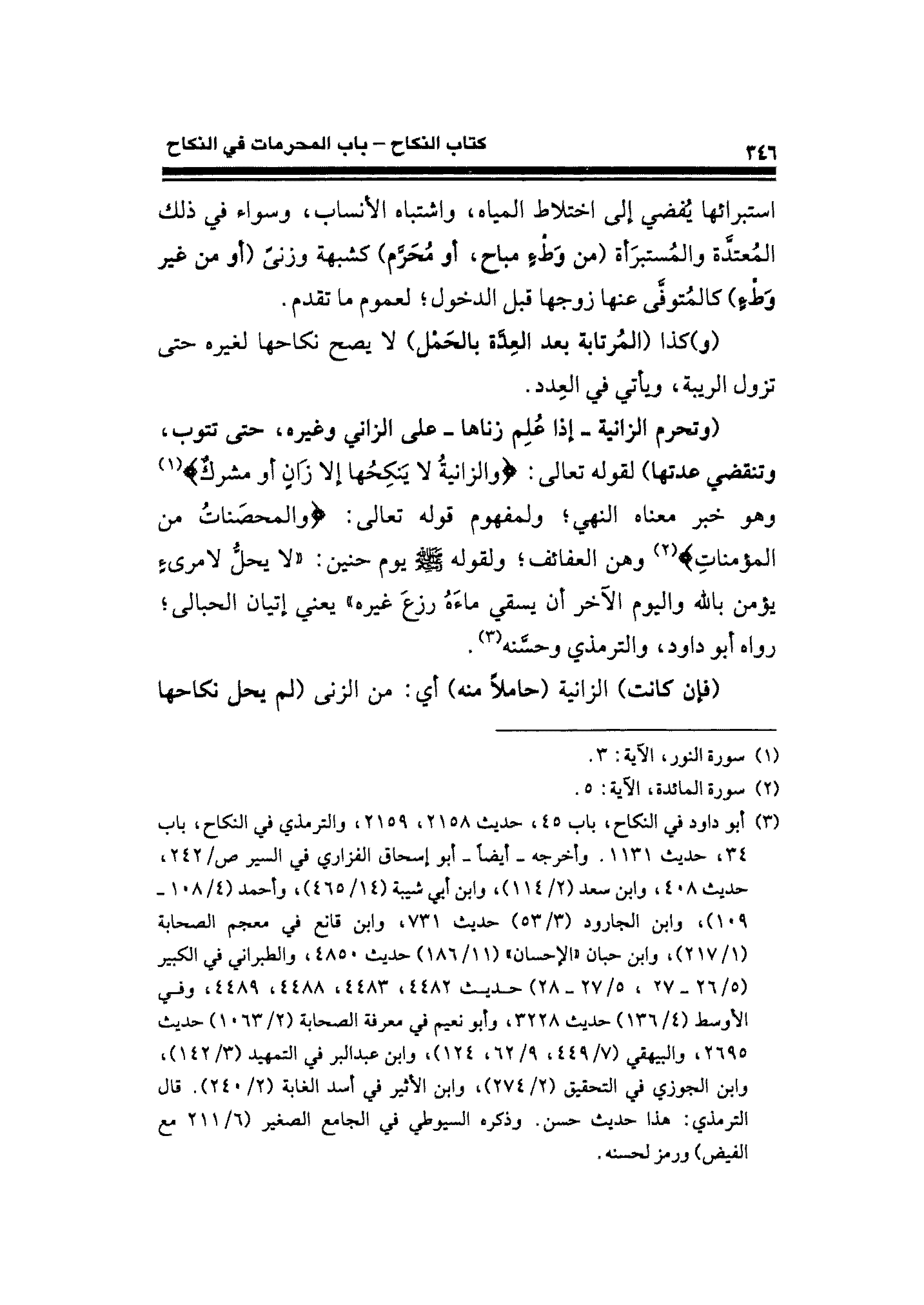 (وتحرم الزانية -إذا عُلِم زناها- على الزاني وغيره، حتَّى تتوب، وتنقضي عدتها) لقوله تعالى: {وَالزَّانِيَةُ لَا يَنْكِحُهَا إِلَّا زَانٍ أَوْ مُشْرِكٌ} (¬١) وهو خبر معناه النهي؛ ولمفهوم قوله تعالى: {والْمُحْصَّنَاتِ مِنْ الْمُؤْمِنَاتِ} (¬٢) وهن العفائف؛ ولقوله - صلى الله عليه وسلم - يوم حنين: "لا يحلُّ لامرئٍ يؤمن بالله واليوم الآخر أن يسقي ماءَهُ رزعَ غيره" يعني إتيان الحبالى؛ رواه أبو داود، والترمذي وحسَّنه (¬٣).