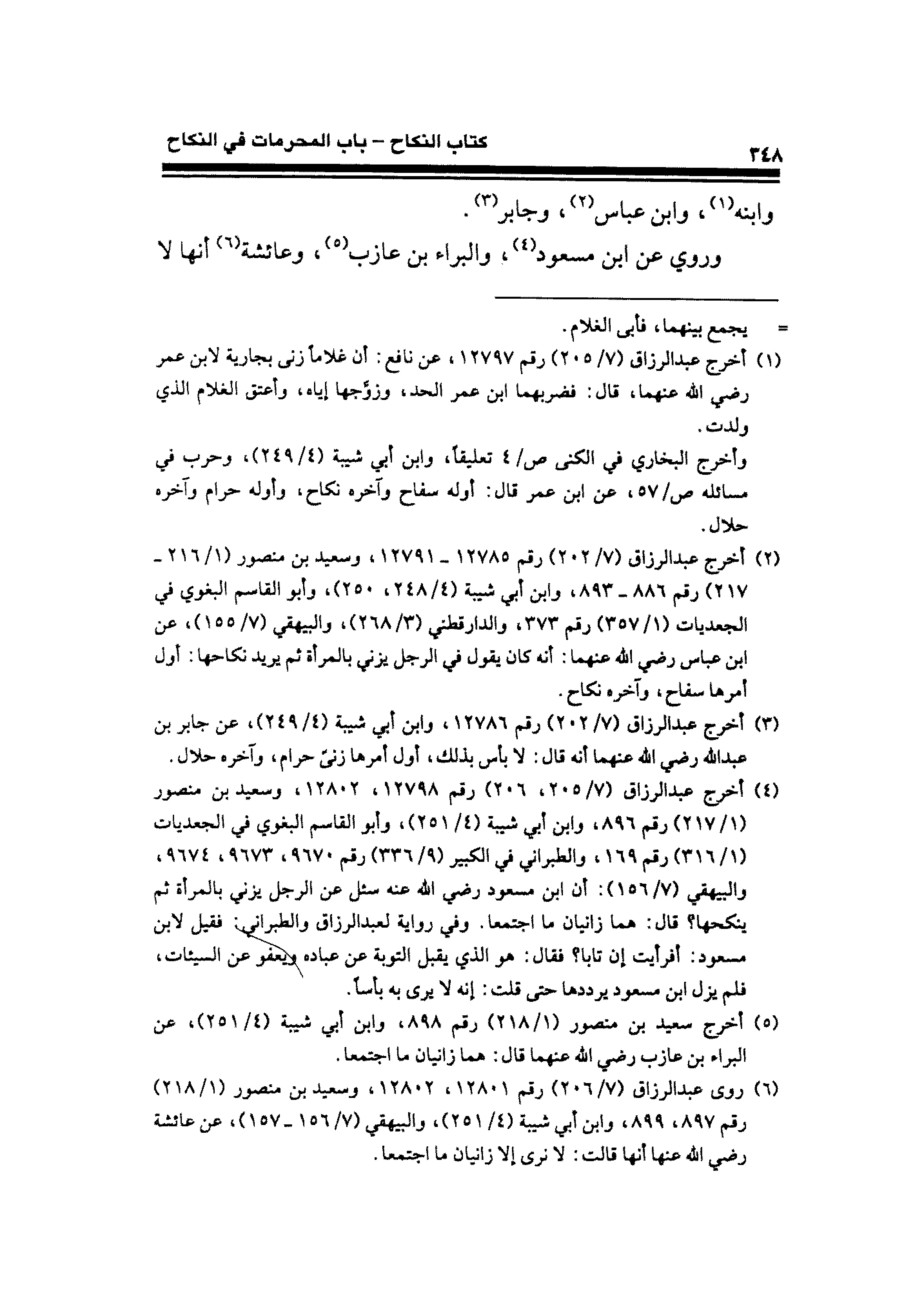 (¬٤) أخرج عبد الرزاق (٧/ ٢٠٥، ٢٠٦) رقم ١٢٧٩٨، ١٢٨٥٢، وسعيد بن منصور (١/ ٢١٧) رقم ٨٩٦، وابن أبي شيبة (٤/ ٢٥١)، وأبو القاسم البغوي في الجعديات (١/ ٣١٦) رقم ١٦٩، والطبراني في الكبير (٩/ ٣٣٦) رقم ٩٦٧٠، ٩٦٧٣، ٩٦٧٤، والبيهقي (٧/ ١٥٦): أن ابن مسعود رضي الله عنه سئل عن الرجل يزني بالمرأة ثم ينكحها؟ قال: هما زانيان ما اجتمعا. وفي رواية لعبد الرزاق والطبراني: فقيل لابن مسعود: أفرأيت إن تابا؟ فقال: هو الَّذي يقبل التوبة عن عباده ويعفوا عن السيئات، فلم يزل ابن مسعود يرددها حتَّى قلت: إنه لا يرى به بأسًا.