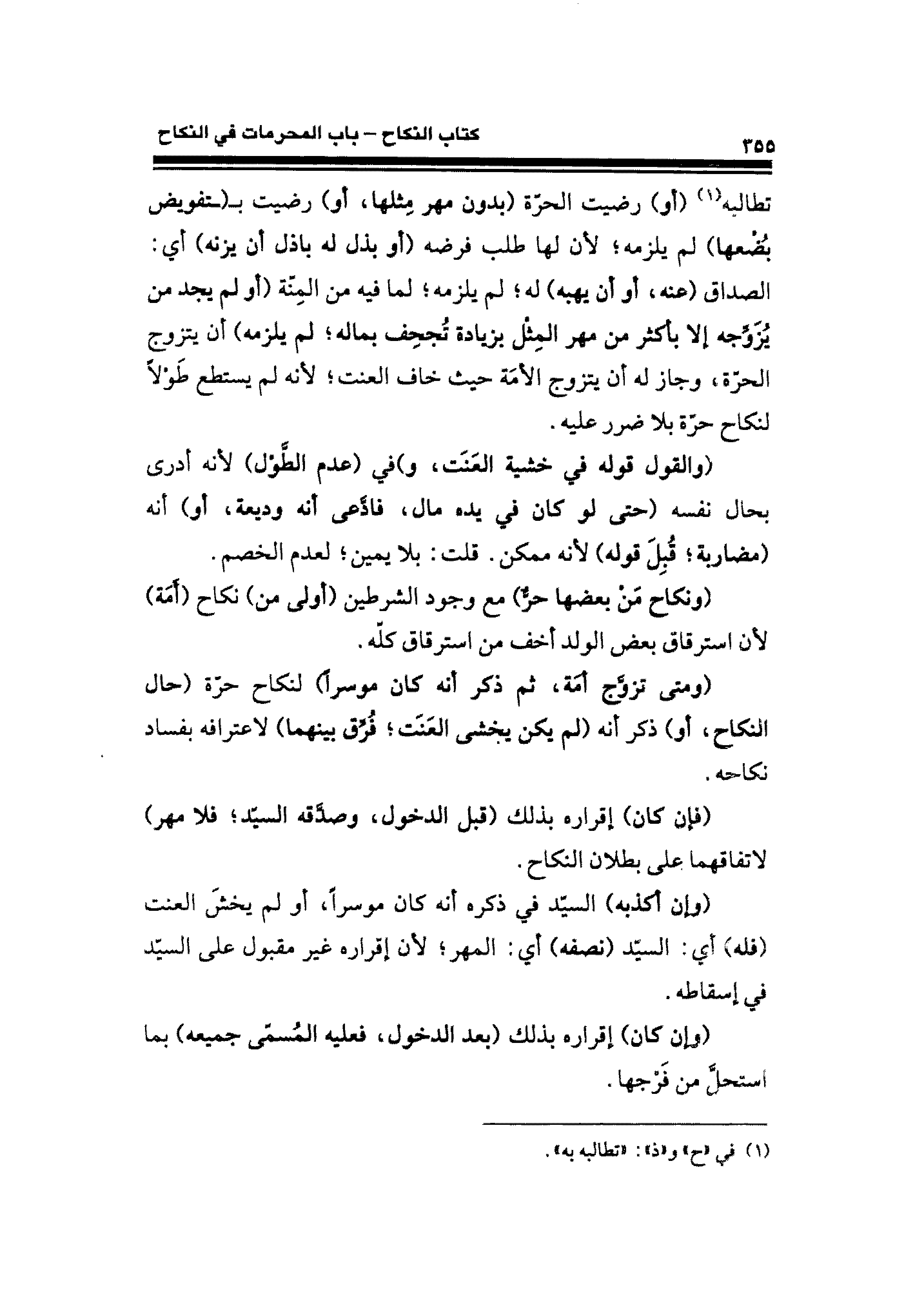 تطالبه (¬١) (أو) رضيت الحرّة (بدون مهر مِثلها، أو) رضيت بـ (ـتفويض بُضْعها) لم يلزمه؛ لأن لها طلب فرضه (أو بذل له باذل أن يزنه) أي: الصداق (عنه، أو أن يهبه) له؛ لم يلزمه؛ لما فيه من المِنّة (أو لم يجد من يُزَوِّجه إلا بأكثر من مهر المِثْل بزيادة تُجحِف بماله؛ لم يلزمه) أن يتزوج الحرّة، وجاز له أن يتزوج الأمَة حيث خاف العنت؛ لأنه لم يستطع طَوْلًا لنكاح حرّة بلا ضرر عليه.