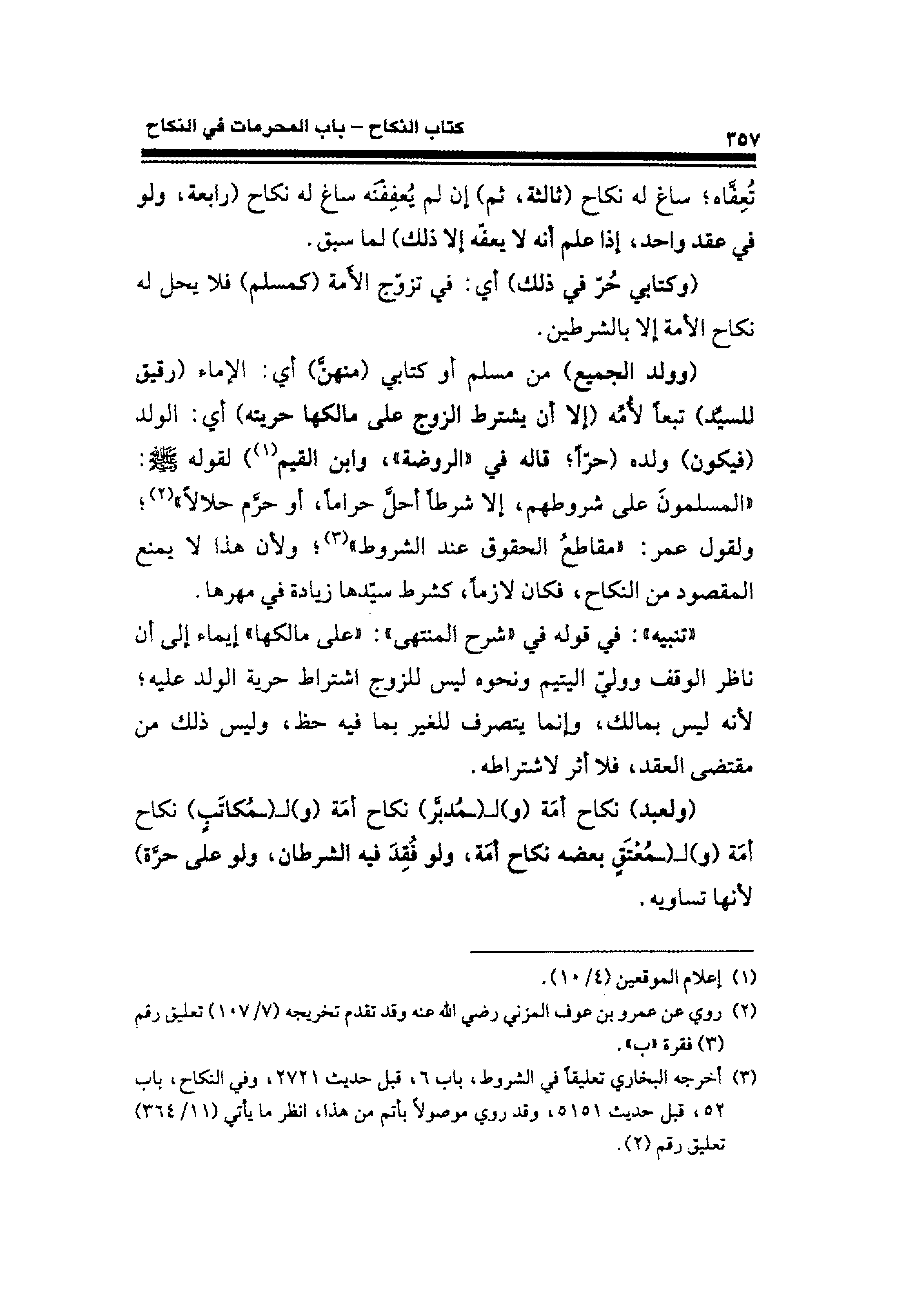 (وولد الجميع) من مسلم أو كتابى (منهنَّ) أي: الإماء (رقيق للسيد) تبعًا لأمه (إلا أن يشترط الزوج على مالكها حريته) أي: الولد (فيكون) ولده (حرًا؛ قاله في "الروضة"، وابن القيم (¬١) لقوله - صلى الله عليه وسلم -: "المسلمونَ على شروطهم، إلا شرطًا أحل حرامًا، أو حزم حلالًا" (¬٢)؛ ويقول عمر: "مقاطعُ الحقوق عند الشروط" (¬٣)؛ ولأن هذا لا يمنع المقصود من النكاح، فكان لازمًا، كشرط سيّدها زيادة في مهرها.
