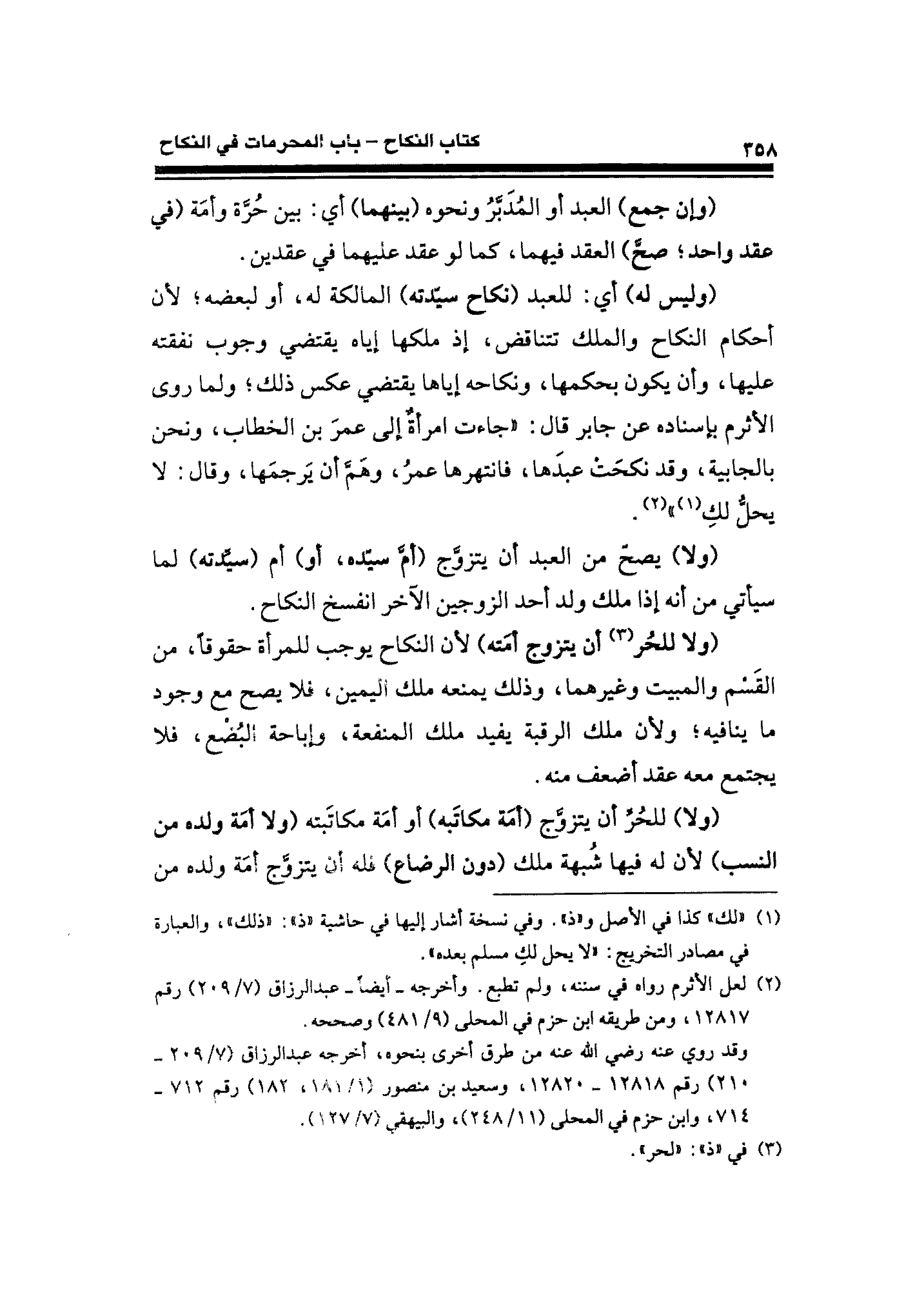 (ولا) للحر أن يتزوج (أمَة مكاتَبه) أو أمَة مكاتَبته (ولا أمة ولده من النسب) لأن له فيها شبهة ملك (دون الرضاع) فله أن يتزوّج أمَة ولده من