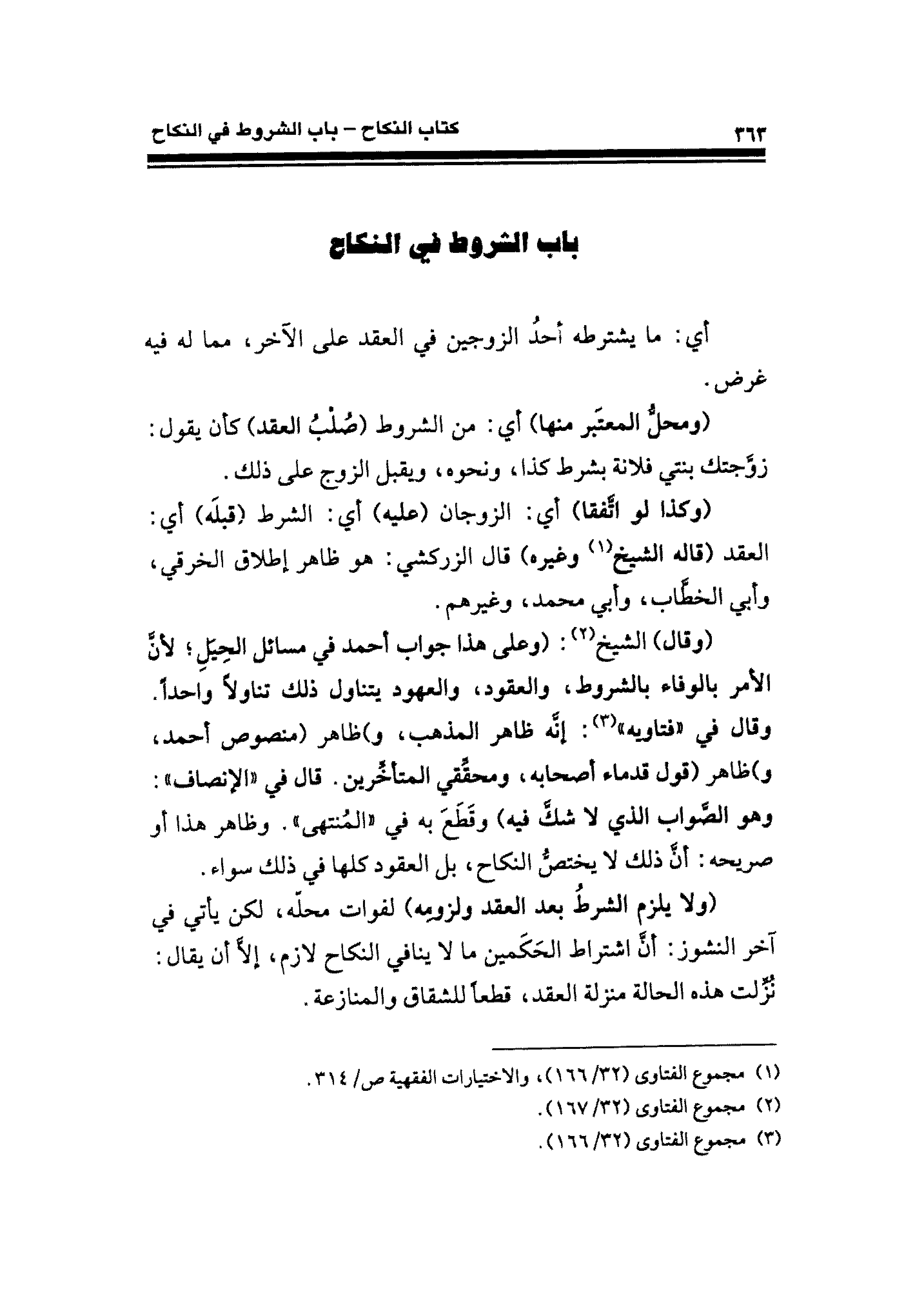 (وقال) الشيخ (¬٢): (وعلى هذا جراب أحمد في مسائل الحِيَلِ؛ لأن الأمر بالوفاء بالشروط، والعقود، والعهود يتناول ذلك تناولًا واحدًا. وقال في "فتاويه" (¬٣): أنه ظاهر المذهب، و) ظاهر (منصوص أحمد، و) ظاهر (قول قدماء أصحابه، ومحققي المتأخِّرين. قال في "الإنصاف": وهو الصّواب الذي لا شك فيه) وقَطَعَ به في "المنتهي". وظاهر هذا أو صريحه: أن ذلك لا يختص النكاح، بل العقود كلها في ذلك سواء.
