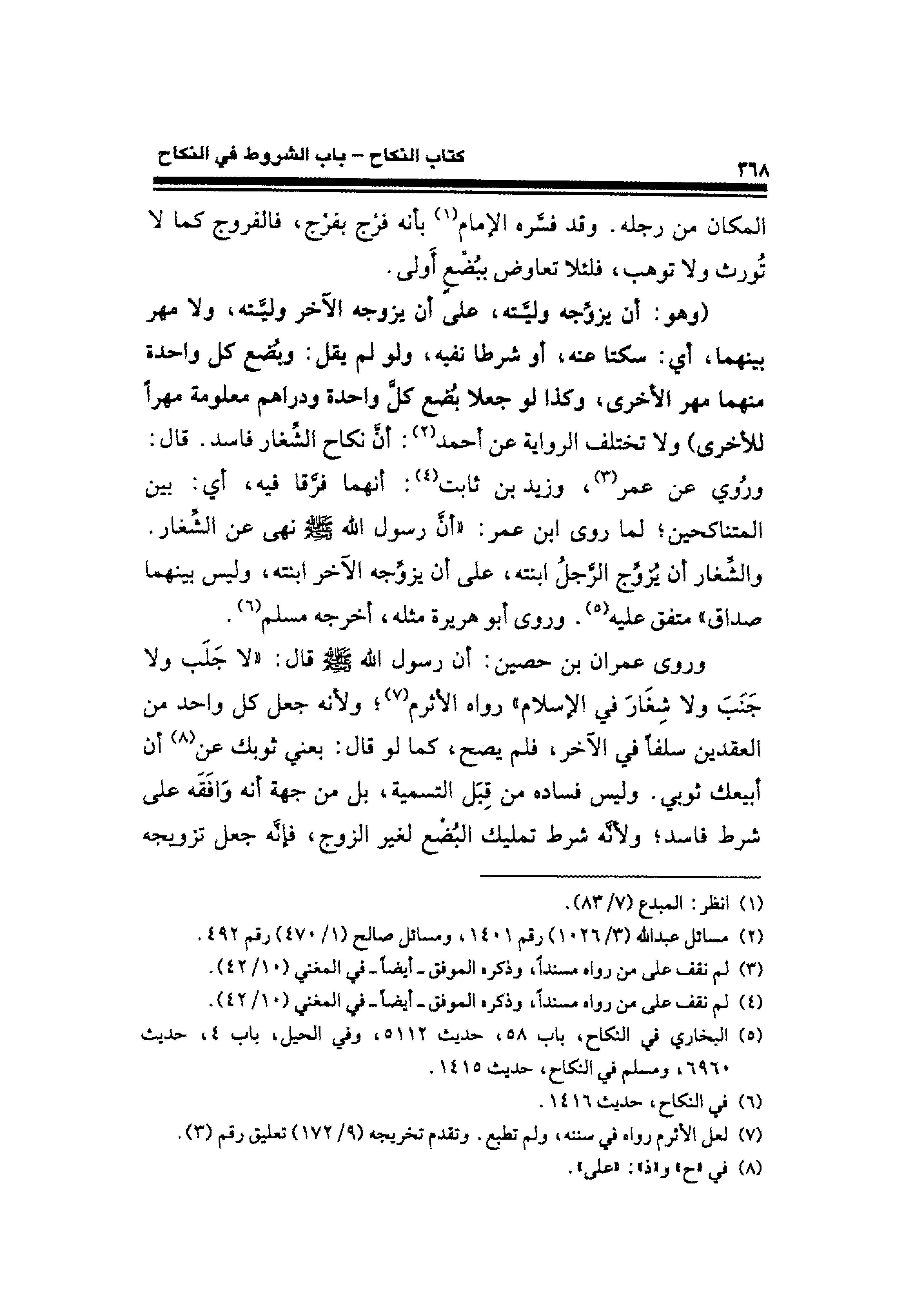 (وهو: أن يزوجه وليَّته، على أن يزوجه الآخر وليَّته، ولا مهر بينهما، أي: سكتا عنه، أو شرطا نفيه، ولو لم يقل: وبُضع كل واحدة منهما مهر الأخرى، وكذا لو جعلا بضع كل واحدة ودراهم معلومة مهرًا للأخرى) ولا تختلف الرواية عن أحمد (¬٢): أن نكاح الشغار فاسد. قال: ورُوي عن عمر (¬٣)، وزيد بن ثابت (¬٤): أنهما فرَّقا فيه، أي: بين المتناكحين؛ لما روى ابن عمر: "أن رسول الله - صلى الله عليه وسلم - نهى عن الشغار. والشغار أن يزوج الرَّجلُ ابنته، على أن يزوِّجه الآخر ابنته، وليس بينهما صداق" متفق عليه (¬٥). وروى أبو هريرة مثله، أخرجه مسلم (¬٦).