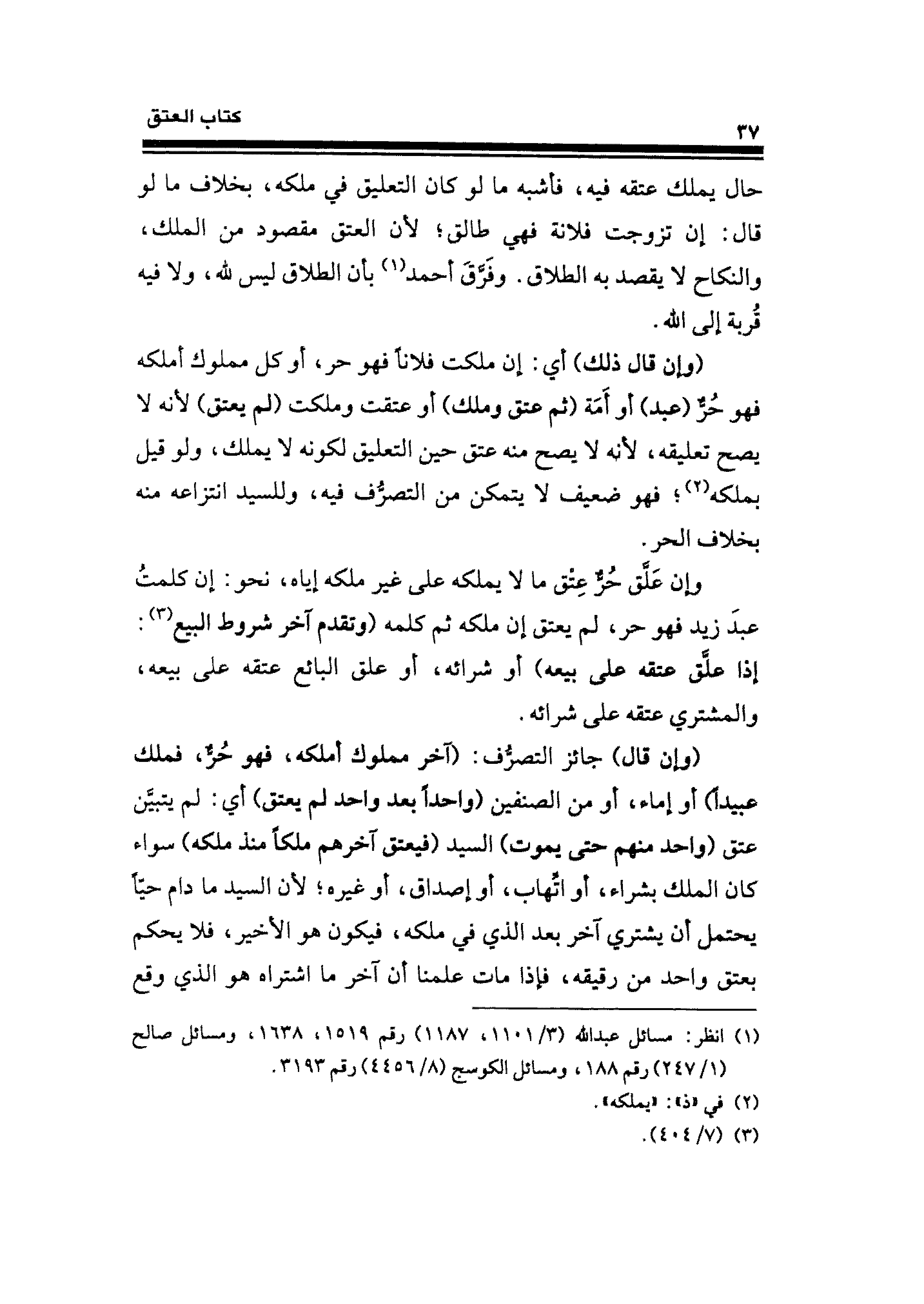 وإن عَلَّق حُرٌّ عِتق ما لا يملكه على غير ملكه إياه، نحو: إن كلمتُ عبدَ زيد فهو حر، لم يعتق إن ملكه ثم كلمه (وتقدم آخر شروط البيع (¬٣): إذا علَّق عتقه على بيعه) أو شرائه، أو علق البائع عتقه على بيعه، والمشتري عتقه على شرائه.