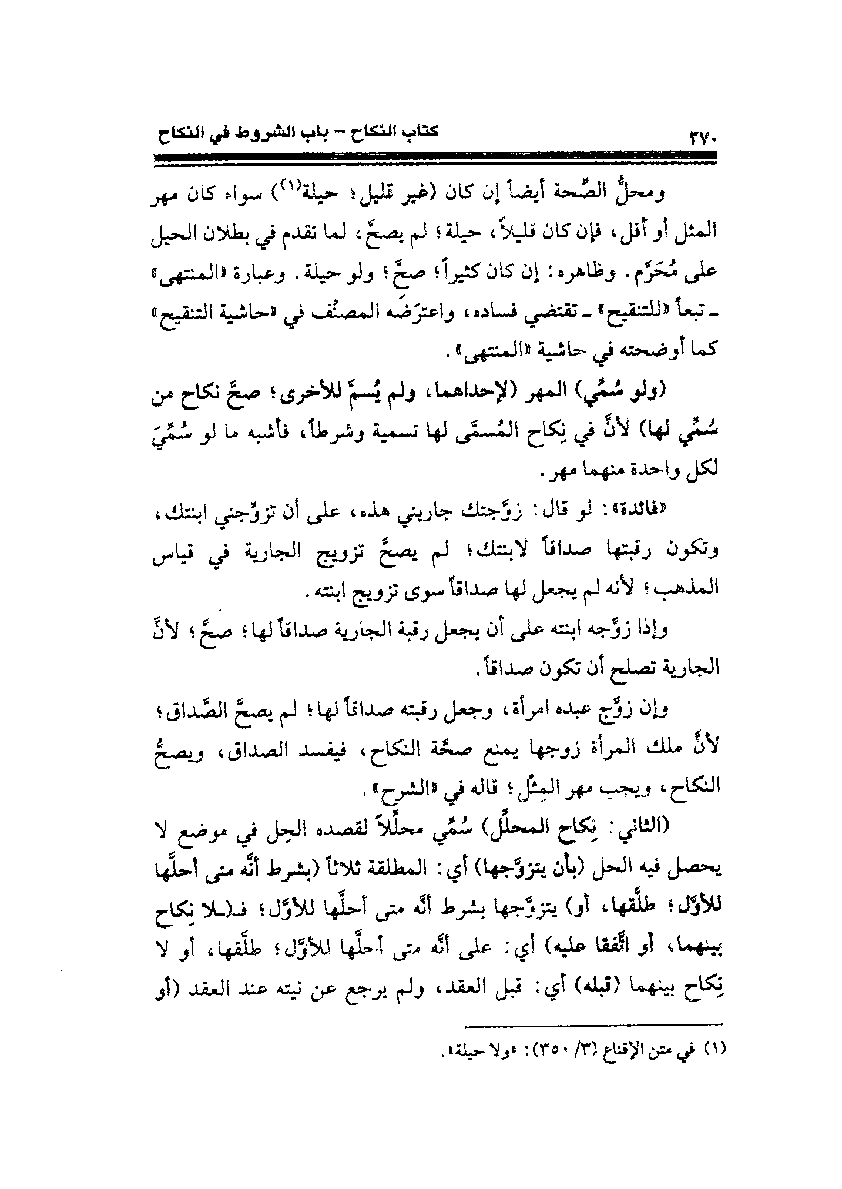 ومحلُّ الصِّحة أيضًا أن كان (غير قليل؛ حيلة (¬١)) سواء كان مهر المثل أو أقل، فإن كان قليلًا، حيلة؛ لم يصحّ، لما تقدم في بطلان الحيل على مُحَرَّم. وظاهره: إن كان كثيرًا؛ صح؛ ولو حيلة. وعبارة "المنتهى" -تبعًا "للتنقيح"- تقتضي فساده، واعترَضَه المصنِّف في "حاشية التنقيح" كما أوضحته في حاشية "المنتهى".